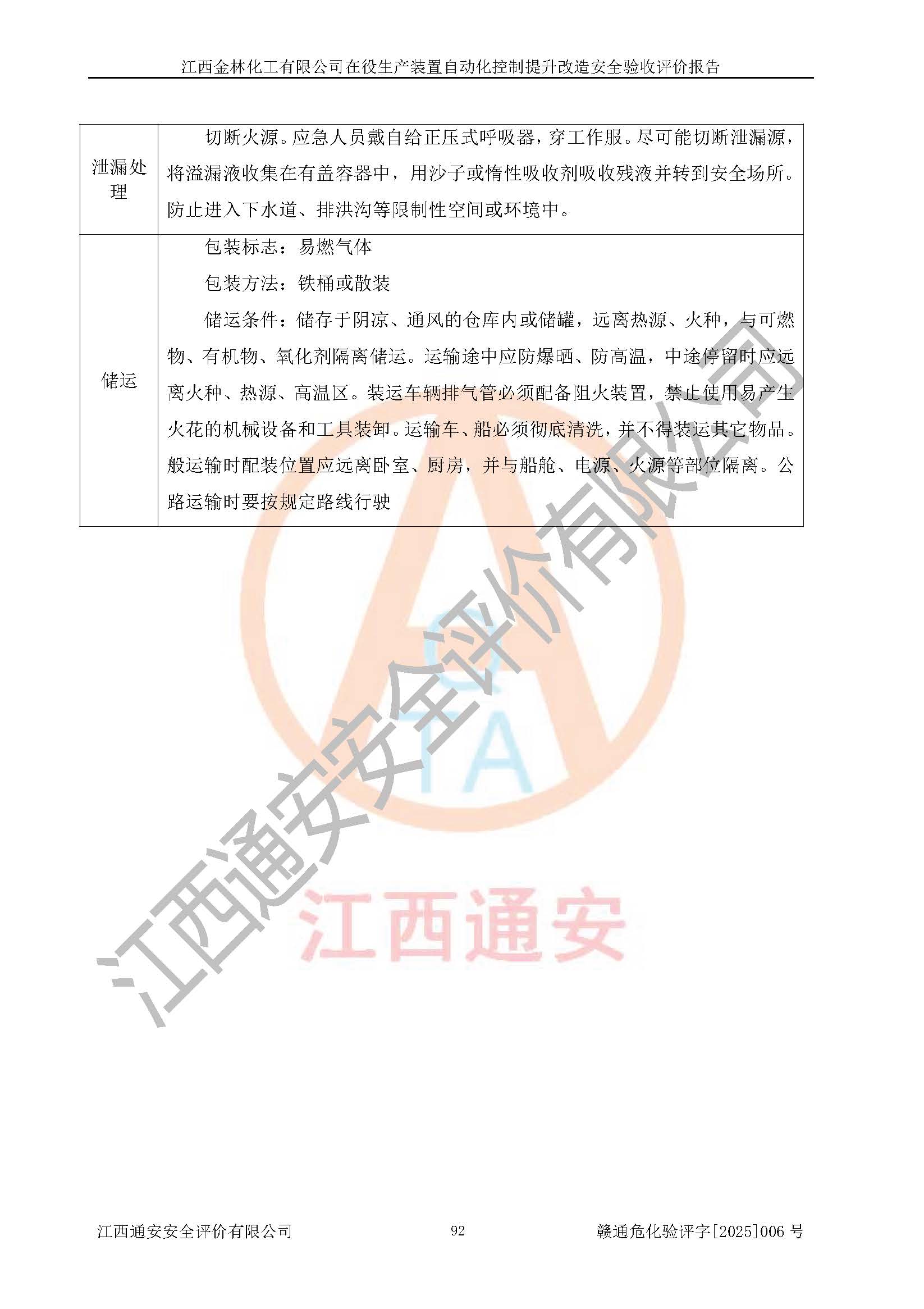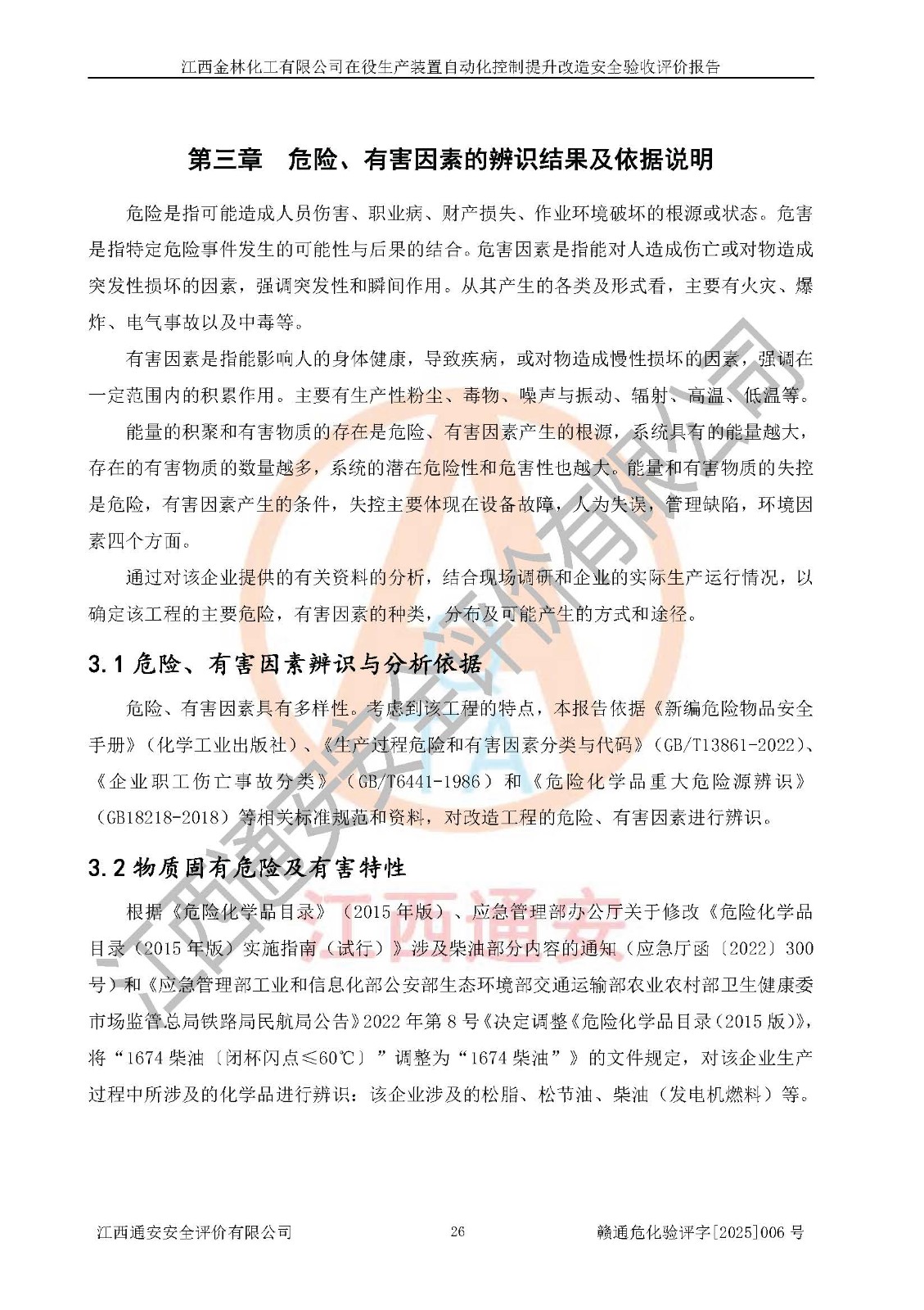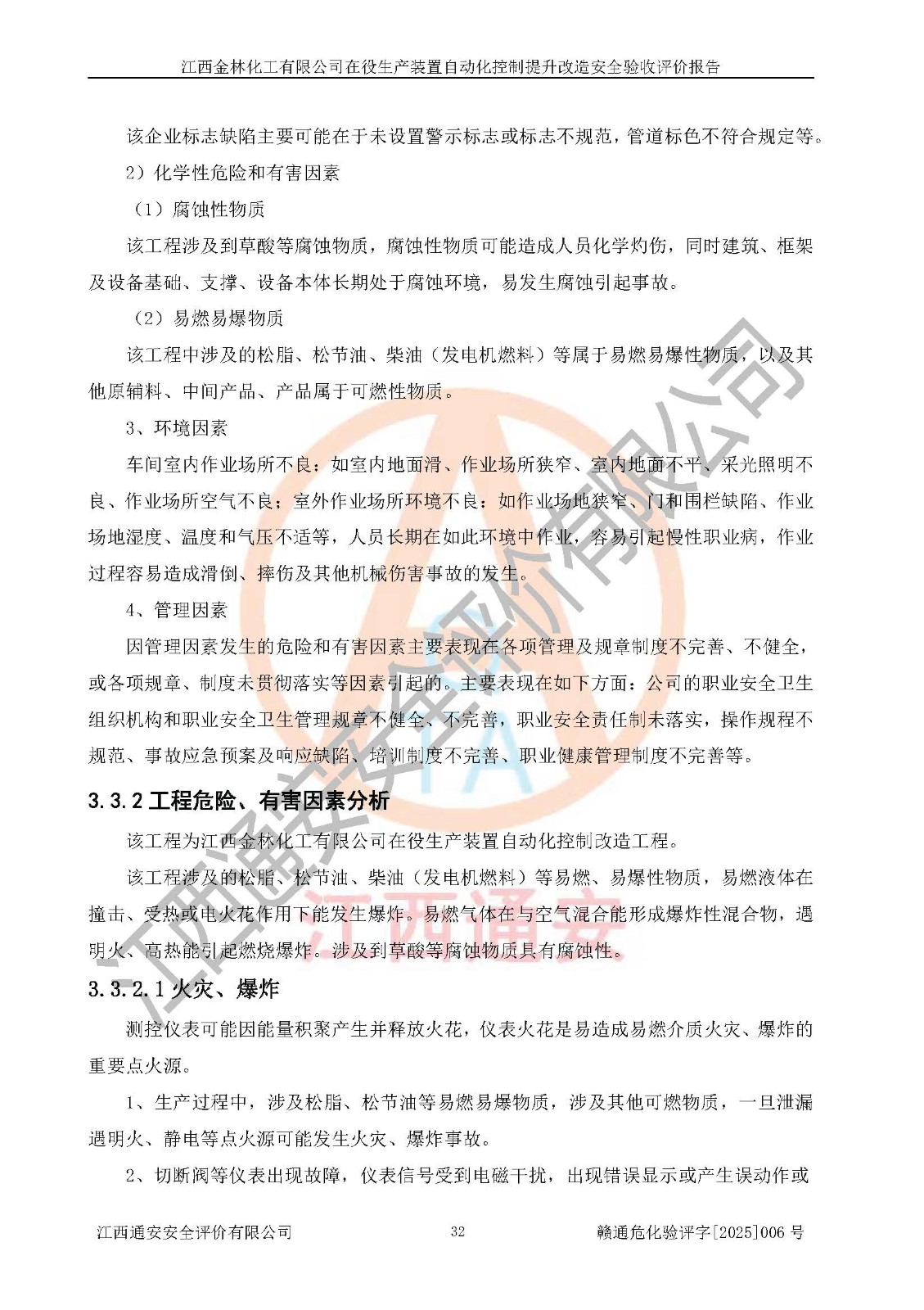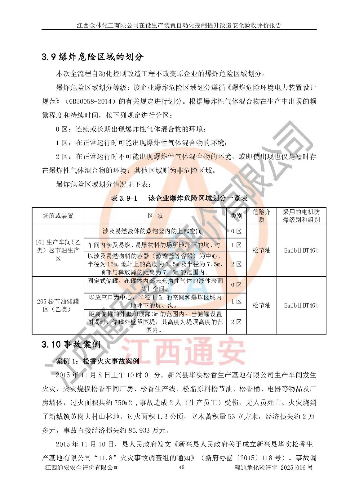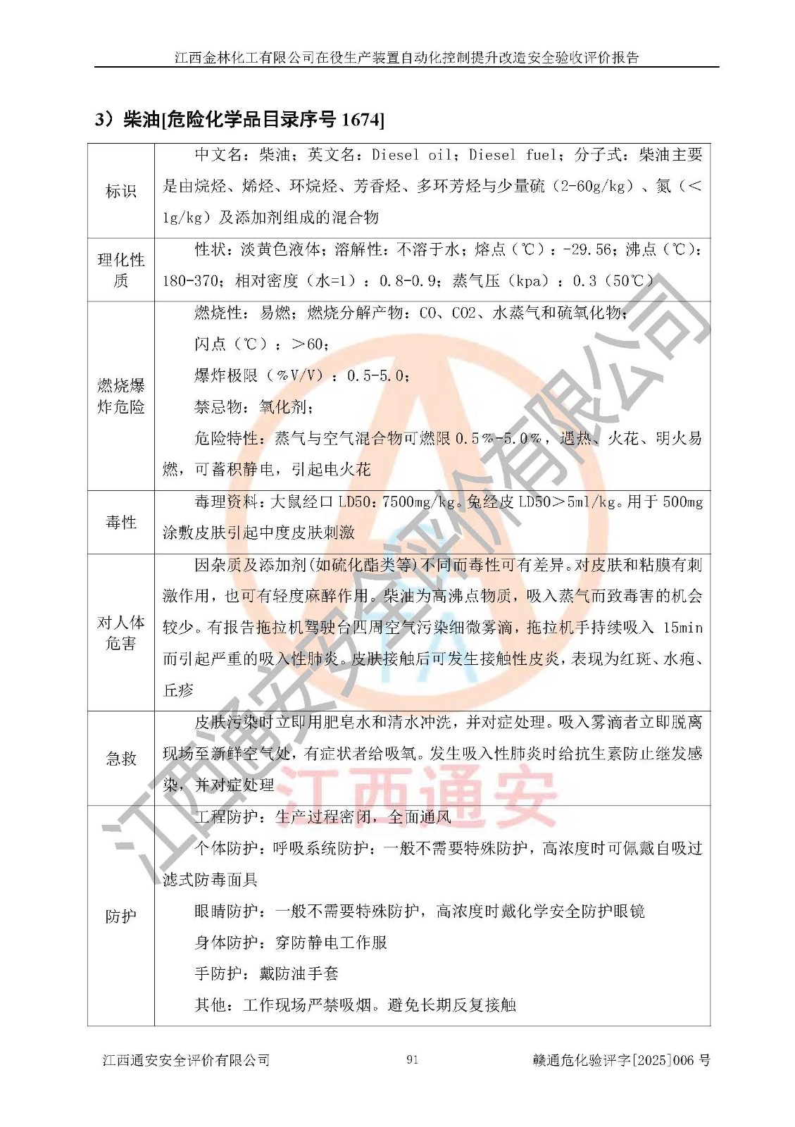 項(xiàng)目簡(jiǎn)介 | 江西金林化工有限公司成立于2003年6月26日,并取得了吉水縣市場(chǎng)監(jiān)督管理局頒發(fā)的《營(yíng)業(yè)執(zhí)照》,營(yíng)業(yè)執(zhí)照統(tǒng)一社會(huì)信用代碼:91360822748530538B。公司注冊(cè)住所:江西省吉安市吉水縣文峰工業(yè)城。法定**人:湯光耀,注冊(cè)資本:貳仟零壹拾玖萬(wàn)元整。企業(yè)類型:有限責(zé)任公司(自然人投資或控股)。經(jīng)營(yíng)范圍包括生產(chǎn)、銷售松節(jié)油、松香、林產(chǎn)化工產(chǎn)品、其它化工產(chǎn)品(含苯酚、甲醛)、橡膠產(chǎn)品、(憑化學(xué)危險(xiǎn)品經(jīng)營(yíng)許可證及消防安全檢查意見(jiàn)書(shū)經(jīng)營(yíng))、機(jī)械配件、紙張銷售。 江西金林化工有限公司于2022年8月23日進(jìn)行了安全生產(chǎn)許可證換證,取得江西省應(yīng)急管理廳頒發(fā)的《安全生產(chǎn)許可證》,許可證編號(hào)為:(贛)WH安許證字[2005]0118號(hào),許可范圍:松節(jié)油(2kt/a),**期2022年8月23日至2025年8月22日。 江西金林化工有限公司在役生產(chǎn)裝置為年產(chǎn)10000噸松香、2000噸松節(jié)油項(xiàng)目及其配套公用、輔助設(shè)施,主要產(chǎn)品有松香和松節(jié)油。 根據(jù)《危險(xiǎn)化學(xué)品目錄》(2015年版)、應(yīng)急管理部辦公廳關(guān)于修改《危險(xiǎn)化學(xué)品目錄(2015年版)實(shí)施指南(試行)》涉及柴油部分內(nèi)容的通知(應(yīng)急廳函〔2022〕300號(hào))和《應(yīng)急管理部工業(yè)和信息化部公安部生態(tài)環(huán)境部交通運(yùn)輸部農(nóng)業(yè)農(nóng)村部衛(wèi)生健康委市場(chǎng)監(jiān)管總局鐵路局民航局公告》2022年第8號(hào)《決定調(diào)整《危險(xiǎn)化學(xué)品目錄(2015版)》,將“1674柴油〔閉杯閃點(diǎn)≤60℃〕”調(diào)整為“1674柴油”》的文件規(guī)定,對(duì)該企業(yè)生產(chǎn)過(guò)程中所涉及的化學(xué)品進(jìn)行辨識(shí):該企業(yè)涉及的松脂、松節(jié)油、柴油(發(fā)電機(jī)燃料)等為危險(xiǎn)化學(xué)品。 | |||