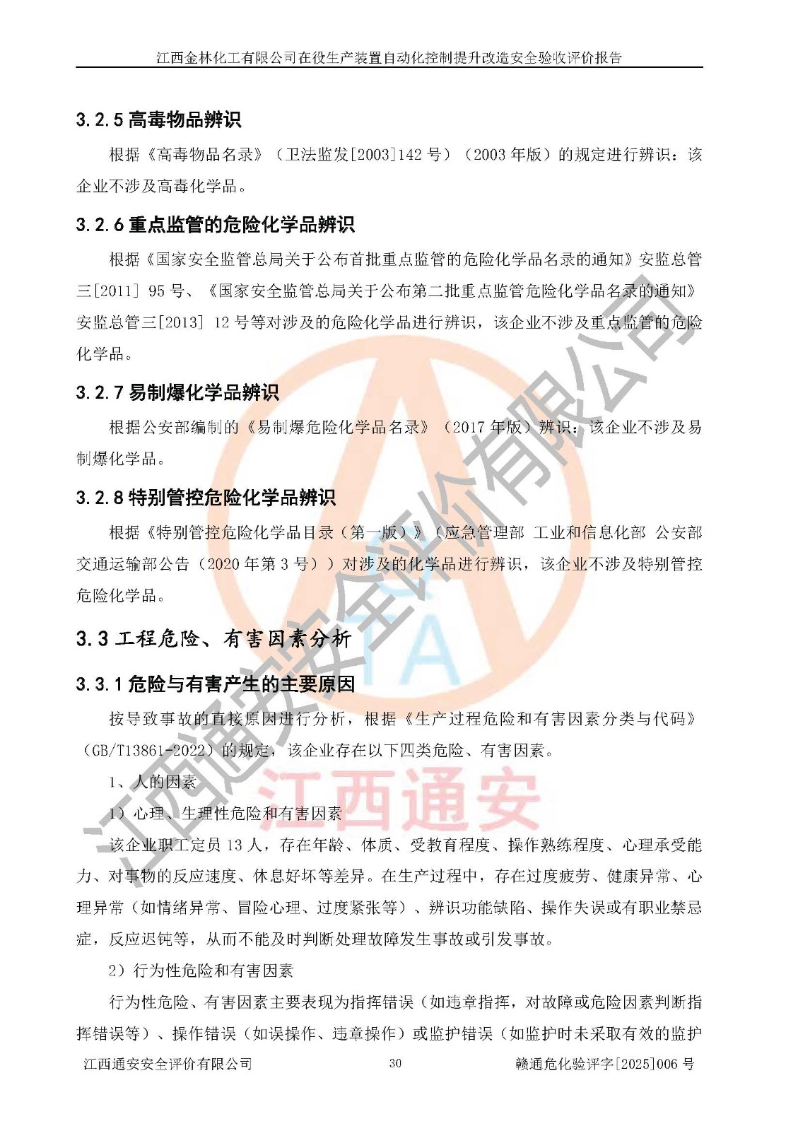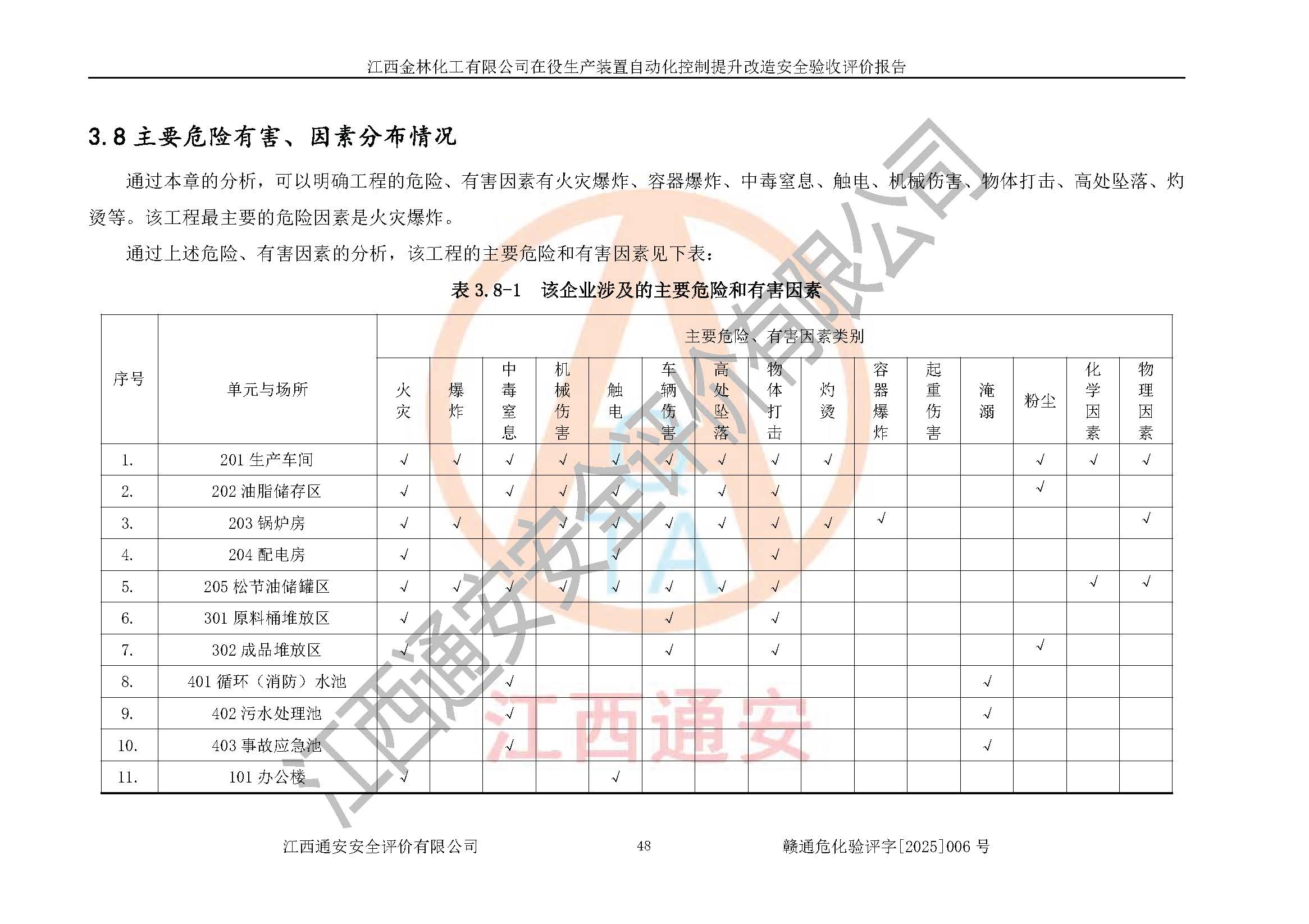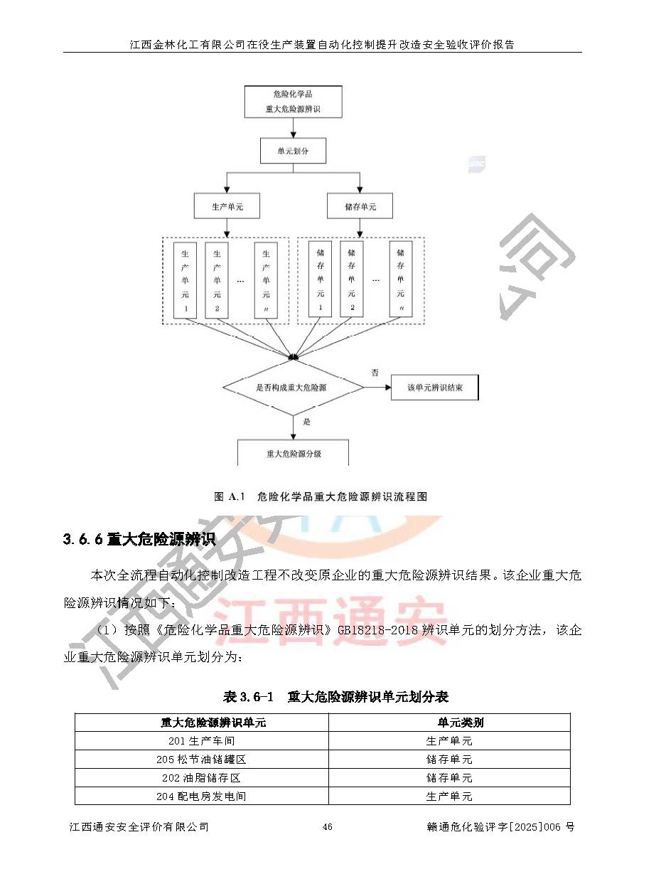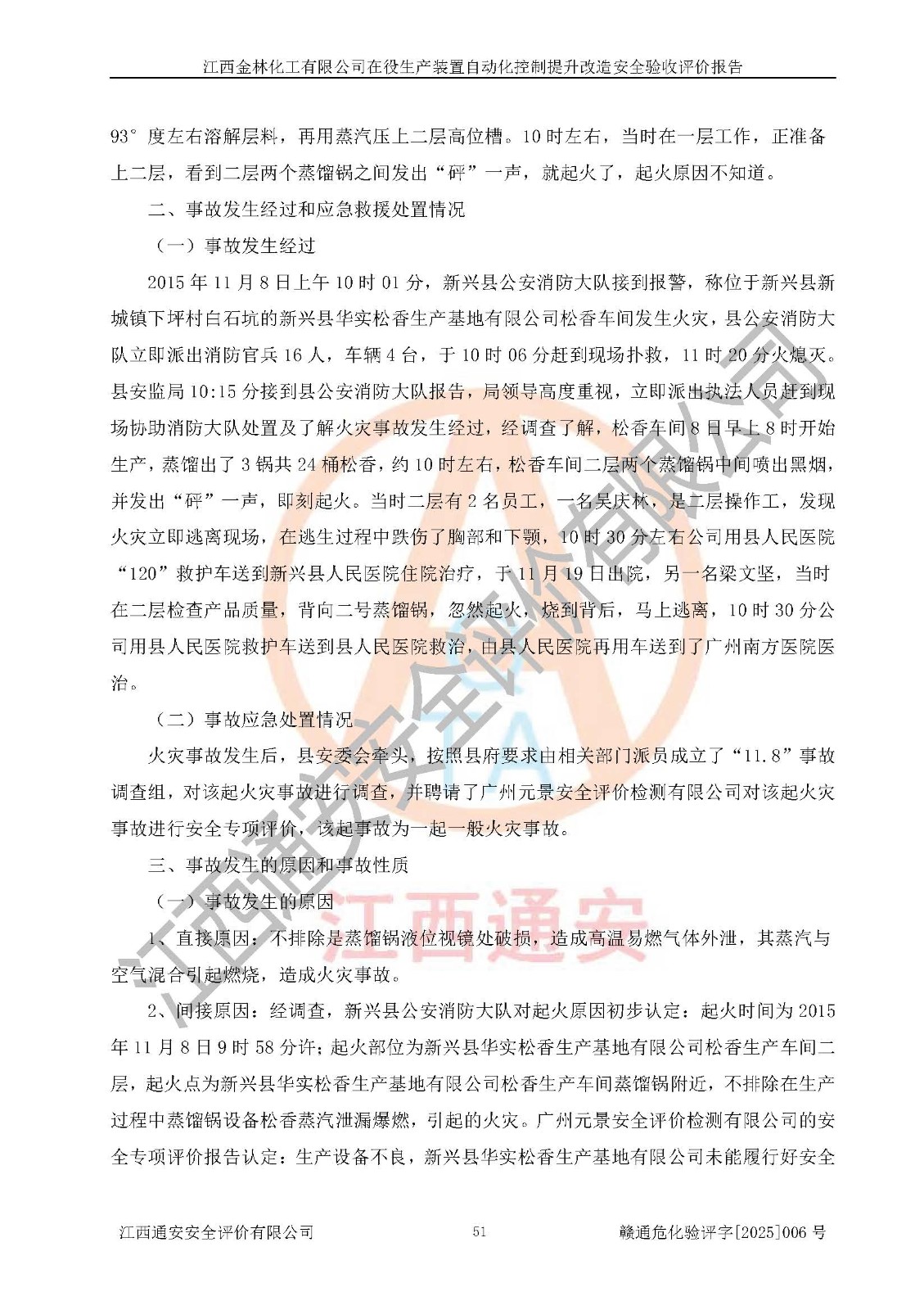 項(xiàng)目簡(jiǎn)介 | 江西金林化工有限公司成立于2003年6月26日,并取得了吉水縣市場(chǎng)監(jiān)督管理局頒發(fā)的《營(yíng)業(yè)執(zhí)照》,營(yíng)業(yè)執(zhí)照統(tǒng)一社會(huì)信用代碼:91360822748530538B。公司注冊(cè)住所:江西省吉安市吉水縣文峰工業(yè)城。法定**人:湯光耀,注冊(cè)資本:貳仟零壹拾玖萬(wàn)元整。企業(yè)類型:有限責(zé)任公司(自然人投資或控股)。經(jīng)營(yíng)范圍包括生產(chǎn)、銷售松節(jié)油、松香、林產(chǎn)化工產(chǎn)品、其它化工產(chǎn)品(含苯酚、甲醛)、橡膠產(chǎn)品、(憑化學(xué)危險(xiǎn)品經(jīng)營(yíng)許可證及消防安全檢查意見(jiàn)書(shū)經(jīng)營(yíng))、機(jī)械配件、紙張銷售。 江西金林化工有限公司于2022年8月23日進(jìn)行了安全生產(chǎn)許可證換證,取得江西省應(yīng)急管理廳頒發(fā)的《安全生產(chǎn)許可證》,許可證編號(hào)為:(贛)WH安許證字[2005]0118號(hào),許可范圍:松節(jié)油(2kt/a),**期2022年8月23日至2025年8月22日。 江西金林化工有限公司在役生產(chǎn)裝置為年產(chǎn)10000噸松香、2000噸松節(jié)油項(xiàng)目及其配套公用、輔助設(shè)施,主要產(chǎn)品有松香和松節(jié)油。 根據(jù)《危險(xiǎn)化學(xué)品目錄》(2015年版)、應(yīng)急管理部辦公廳關(guān)于修改《危險(xiǎn)化學(xué)品目錄(2015年版)實(shí)施指南(試行)》涉及柴油部分內(nèi)容的通知(應(yīng)急廳函〔2022〕300號(hào))和《應(yīng)急管理部工業(yè)和信息化部公安部生態(tài)環(huán)境部交通運(yùn)輸部農(nóng)業(yè)農(nóng)村部衛(wèi)生健康委市場(chǎng)監(jiān)管總局鐵路局民航局公告》2022年第8號(hào)《決定調(diào)整《危險(xiǎn)化學(xué)品目錄(2015版)》,將“1674柴油〔閉杯閃點(diǎn)≤60℃〕”調(diào)整為“1674柴油”》的文件規(guī)定,對(duì)該企業(yè)生產(chǎn)過(guò)程中所涉及的化學(xué)品進(jìn)行辨識(shí):該企業(yè)涉及的松脂、松節(jié)油、柴油(發(fā)電機(jī)燃料)等為危險(xiǎn)化學(xué)品。 | |||