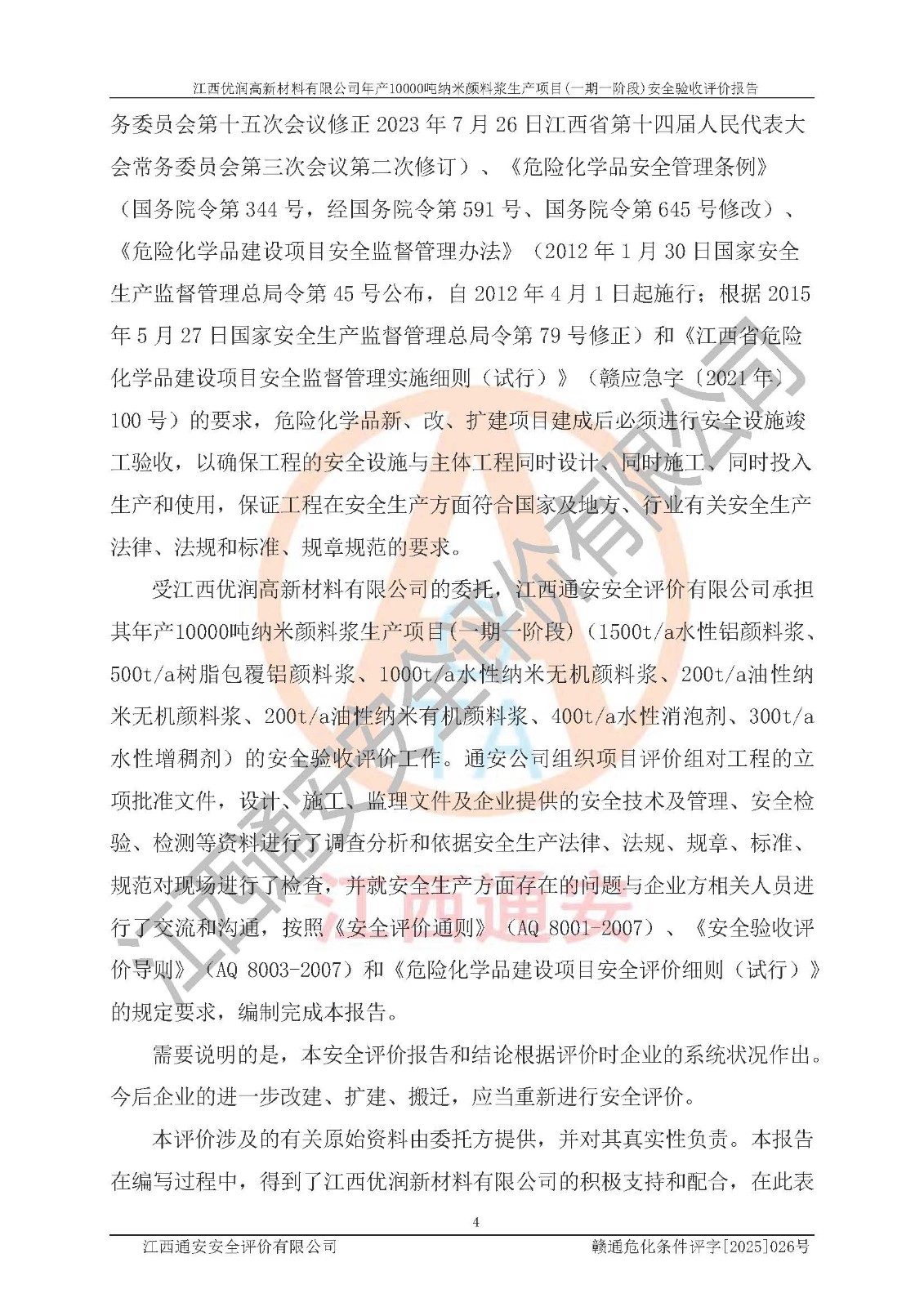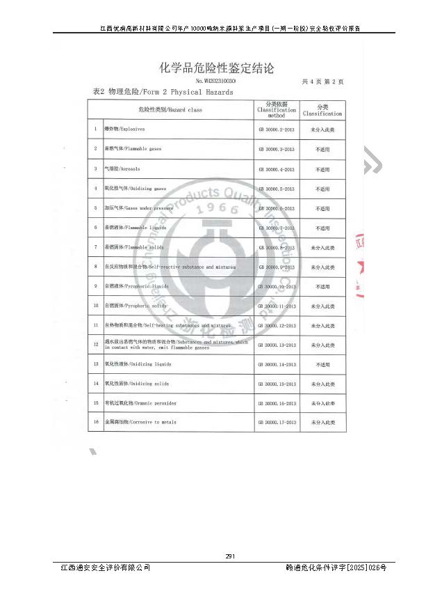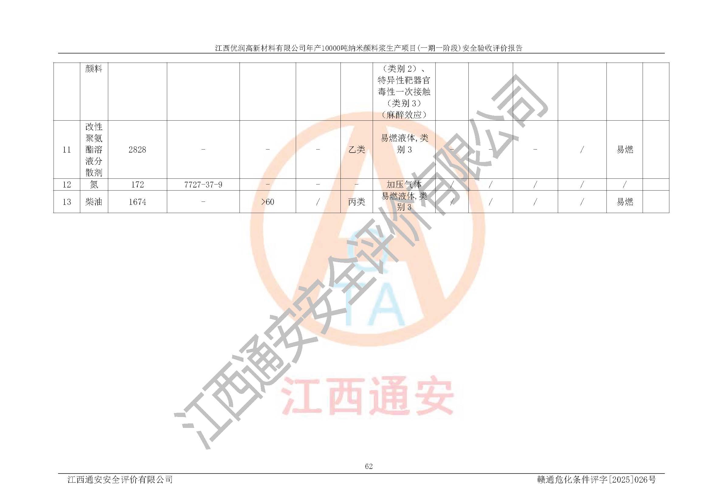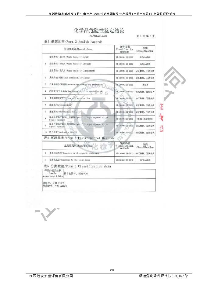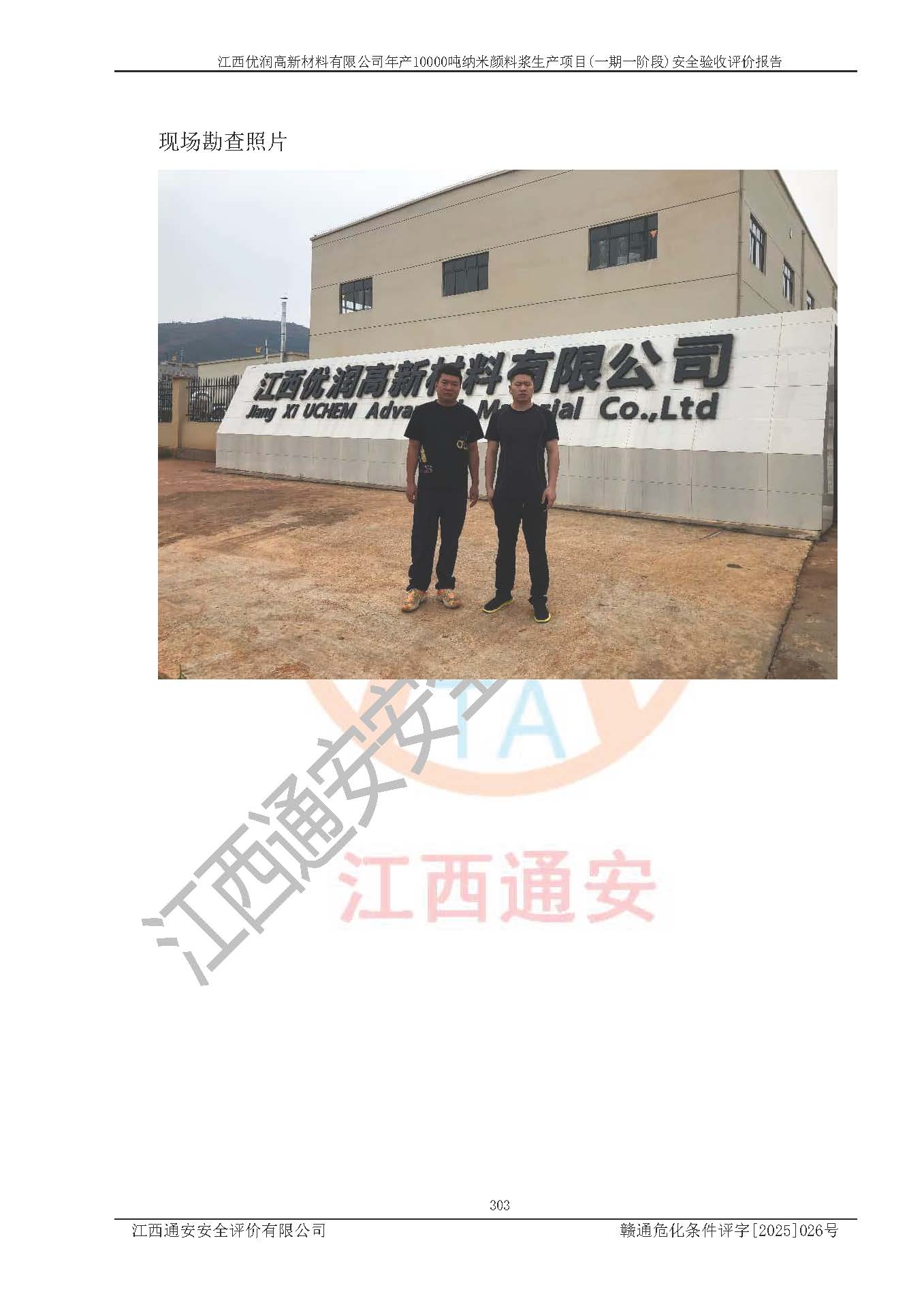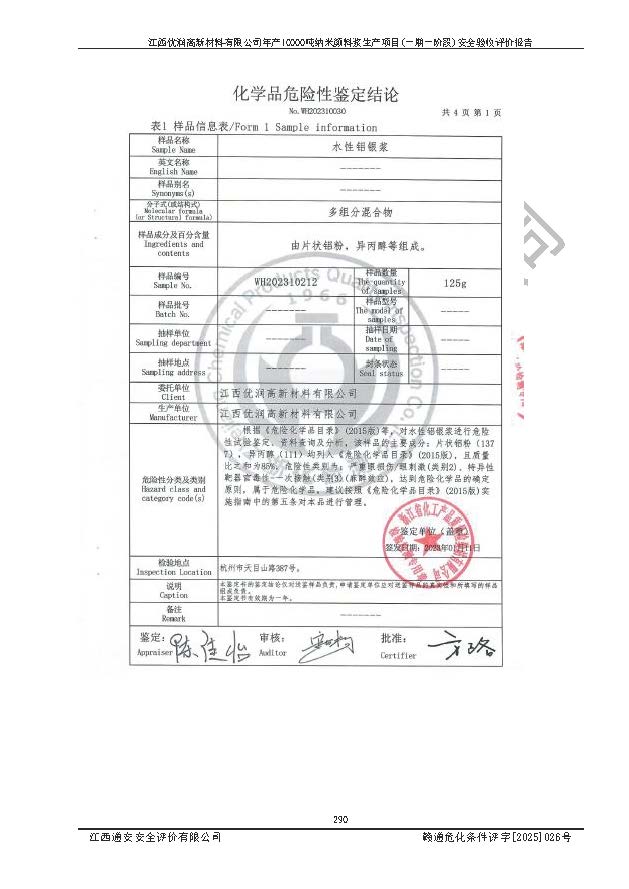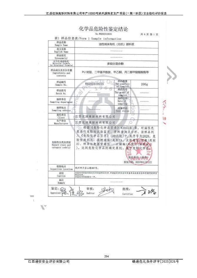 評(píng)價(jià)報(bào)告名稱(chēng) | 江西優(yōu)潤(rùn)高新材料有限公司年產(chǎn)10000噸納米顏料漿生產(chǎn)項(xiàng)目(一期一階段)安全驗(yàn)收評(píng)價(jià)報(bào)告 | |||