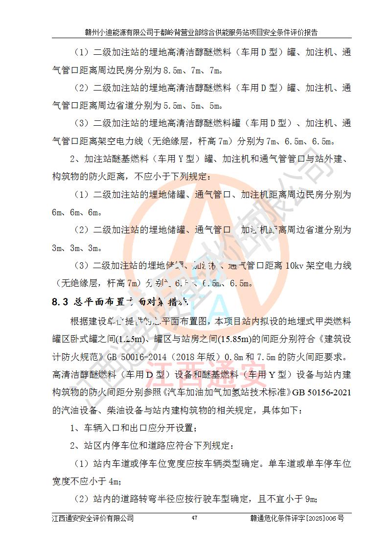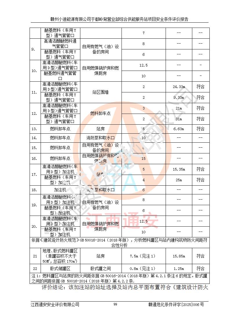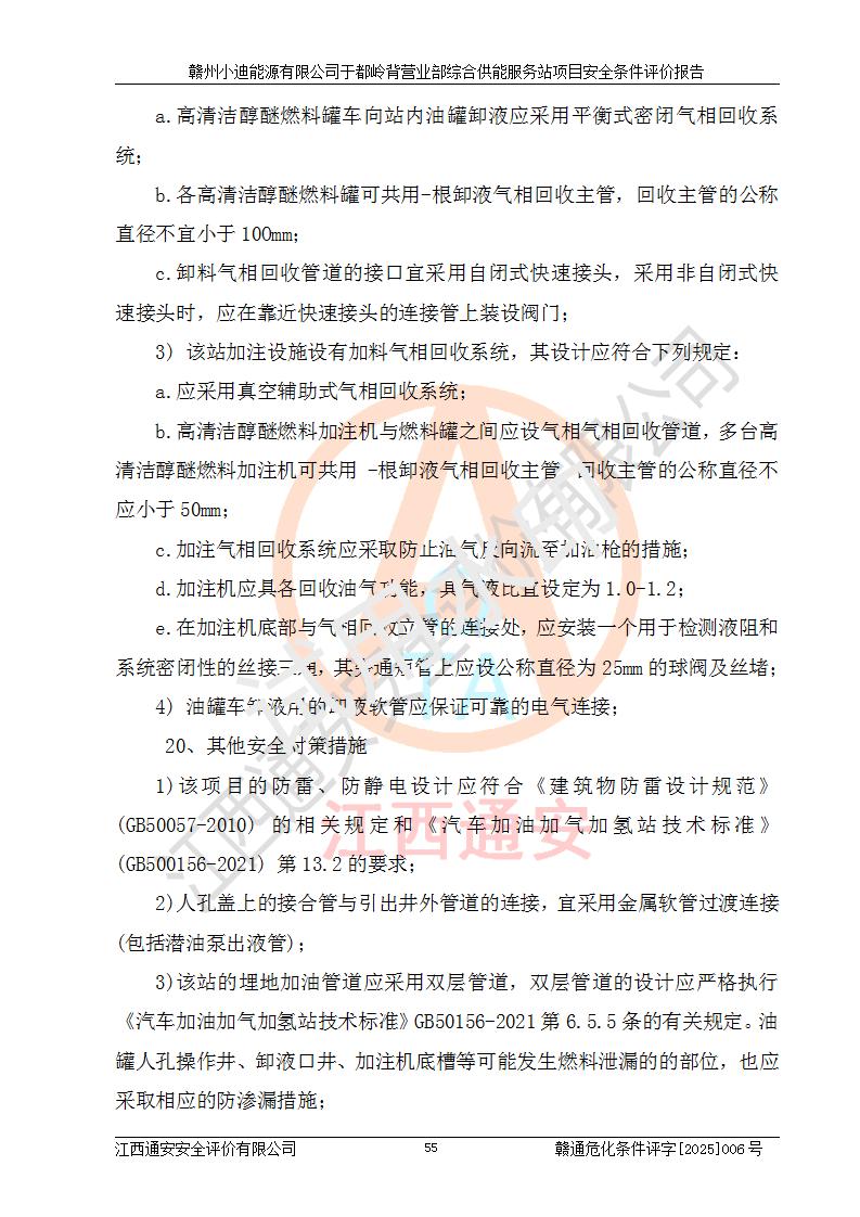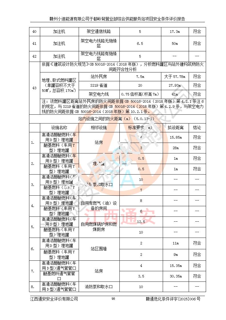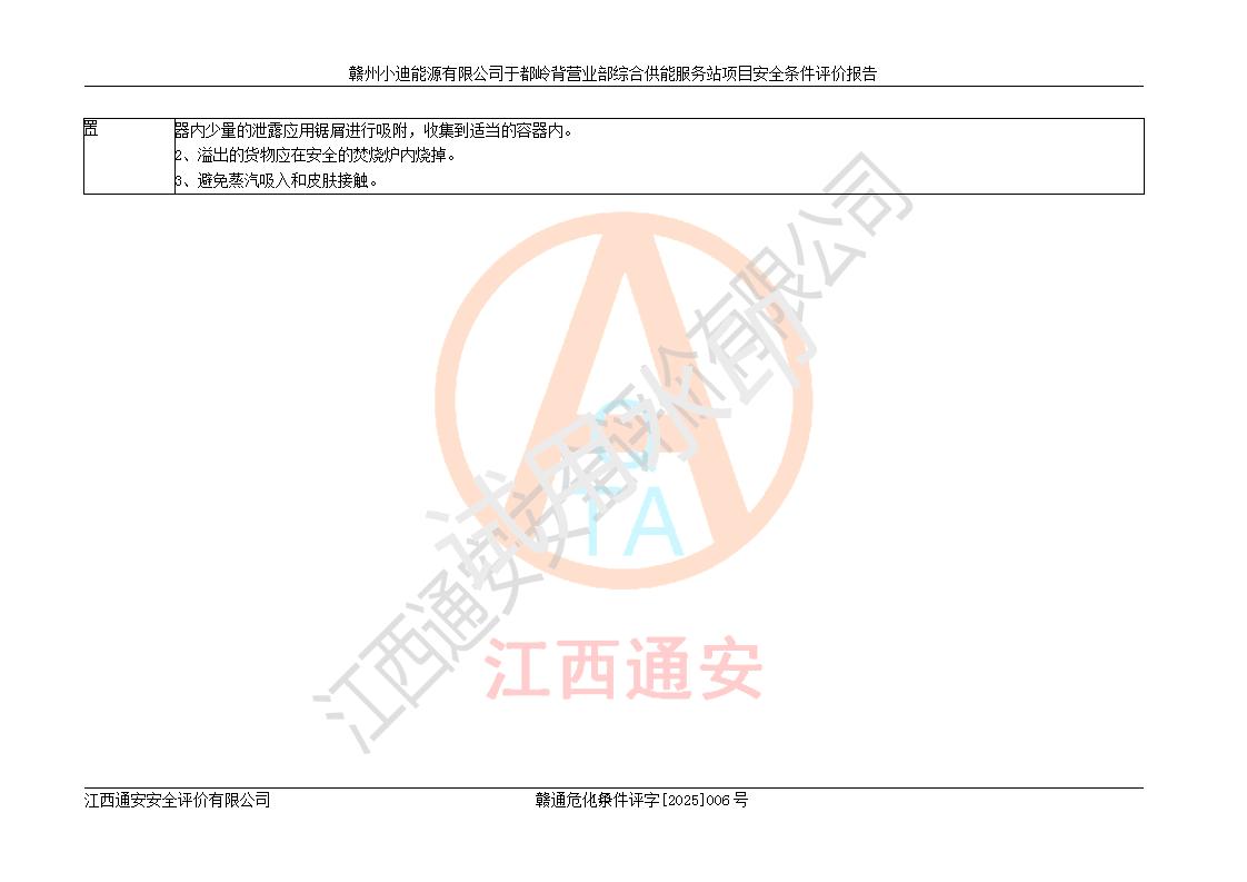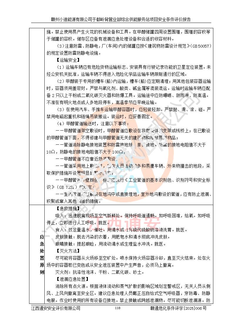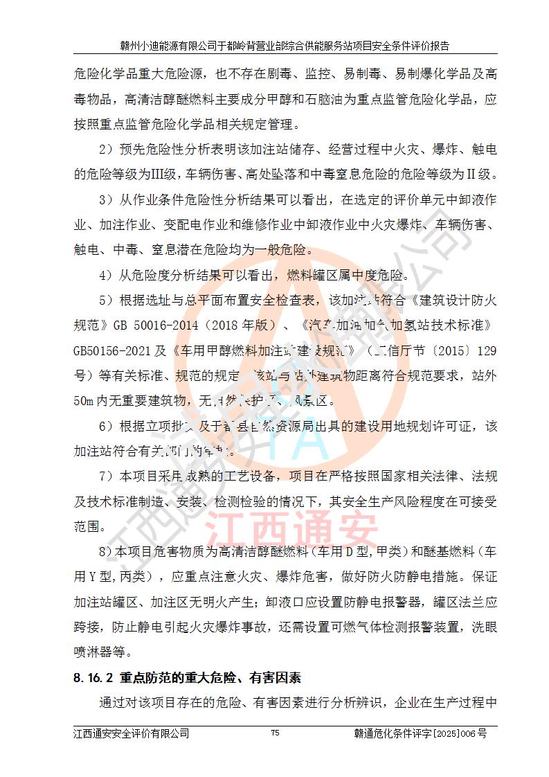 一、安全狀況綜合評(píng)述 通過(guò)對(duì)本項(xiàng)目的危險(xiǎn)、有害因素分析及定性、定量評(píng)價(jià),結(jié)果為: 1)本項(xiàng)目存在的危險(xiǎn)有害因素是火災(zāi)爆炸、**傷害、高處墜落、物體打擊、觸電、機(jī)械傷害、中毒窒息、坍塌等,主要危險(xiǎn)有害因素為火災(zāi)、爆炸等危險(xiǎn)因素。需重點(diǎn)防范的危險(xiǎn)有害因素為火災(zāi)、爆炸。本項(xiàng)目未構(gòu)成危險(xiǎn)化學(xué)品重大危險(xiǎn)源,也不存在劇毒、監(jiān)控、易制毒、易制爆化學(xué)品及高毒物品,高清潔醇醚燃料主要成分甲醇和石腦油為重點(diǎn)監(jiān)管危險(xiǎn)化學(xué)品,應(yīng)按照重點(diǎn)監(jiān)管危險(xiǎn)化學(xué)品相關(guān)規(guī)定管理。 2)預(yù)先危險(xiǎn)性分析表明該加注站儲(chǔ)存、經(jīng)營(yíng)過(guò)程中火災(zāi)、爆炸、觸電的危險(xiǎn)等級(jí)為Ⅲ級(jí),**傷害、高處墜落和中毒窒息等危險(xiǎn)等級(jí)為Ⅱ級(jí)。 3)從作業(yè)條件危險(xiǎn)性分析結(jié)果可以看出,在選定的評(píng)價(jià)單元中卸液作業(yè)、加注作業(yè)、變配電作業(yè)和維修作業(yè)中卸液作業(yè)中火災(zāi)爆炸、**傷害、觸電、中毒、窒息潛在危險(xiǎn)均為一般危險(xiǎn)。 4)從危險(xiǎn)度分析結(jié)果可以看出,燃料罐區(qū)屬中度危險(xiǎn)。 5)根據(jù)選址與總平面布置安全檢查表,該加注站符合《建筑設(shè)計(jì)防火規(guī)范》GB 50016-2014(2018年版)、《汽車(chē)加油加氣加氫站技術(shù)標(biāo)準(zhǔn)》GB50156-2021及《車(chē)用甲醇燃料加注站建設(shè)規(guī)范》(工信廳節(jié)〔2015〕129號(hào))等有關(guān)標(biāo)準(zhǔn)、規(guī)范的規(guī)定。該站與站外建筑物距離符合規(guī)范要求,站外50m內(nèi)無(wú)重要建筑物和明火設(shè)施。 6)根據(jù)立項(xiàng)批文及于都縣自然資源局出具的建設(shè)用地規(guī)劃許可證,該加注站符合有關(guān)部門(mén)的審批。 7)本項(xiàng)目采用成熟的工藝設(shè)備,項(xiàng)目在嚴(yán)格按照**相關(guān)法律、法規(guī)及技術(shù)標(biāo)準(zhǔn)制造、安裝、檢測(cè)檢驗(yàn)的情況下,其安全生產(chǎn)風(fēng)險(xiǎn)程度在可接受范圍。 8)本項(xiàng)目危害物質(zhì)為高清潔醇醚燃料(車(chē)用D型,甲類(lèi))和醚基燃料(車(chē)用Y型,丙類(lèi)),應(yīng)重點(diǎn)注意火災(zāi)、爆炸危害,做好防火防靜電措施。**加注站罐區(qū)、加注區(qū)無(wú)明火產(chǎn)生;卸液口應(yīng)設(shè)置防靜電報(bào)警器,罐區(qū)法蘭應(yīng)跨接,防止靜電引起火災(zāi)爆炸事故。 四、評(píng)價(jià)結(jié)論 贛州小迪能源有限公司于都嶺背營(yíng)業(yè)部綜合供能服務(wù)站項(xiàng)目總平面布置符合相關(guān)規(guī)范的要求。在項(xiàng)目建設(shè)和運(yùn)行階段,總平面布置設(shè)計(jì)、施工圖設(shè)計(jì)和建設(shè)施工、安裝調(diào)試及生產(chǎn)運(yùn)行中,應(yīng)嚴(yán)格執(zhí)行**有關(guān)安全生產(chǎn)法律、法規(guī)和有關(guān)標(biāo)準(zhǔn)、規(guī)范,將本報(bào)告中提出的安全對(duì)策措施落實(shí)到位,真正做到安全設(shè)施與主體工程同時(shí)設(shè)計(jì)、同時(shí)施工、同時(shí)投入生產(chǎn)和使用,項(xiàng)目建成后危險(xiǎn)、有害因素可以得到**控制,安全風(fēng)險(xiǎn)在可接受范圍,擬建的贛州小迪能源有限公司于都嶺背營(yíng)業(yè)部綜合供能服務(wù)站項(xiàng)目符合法律法規(guī)、標(biāo)準(zhǔn)、規(guī)章和規(guī)范的要求。 |