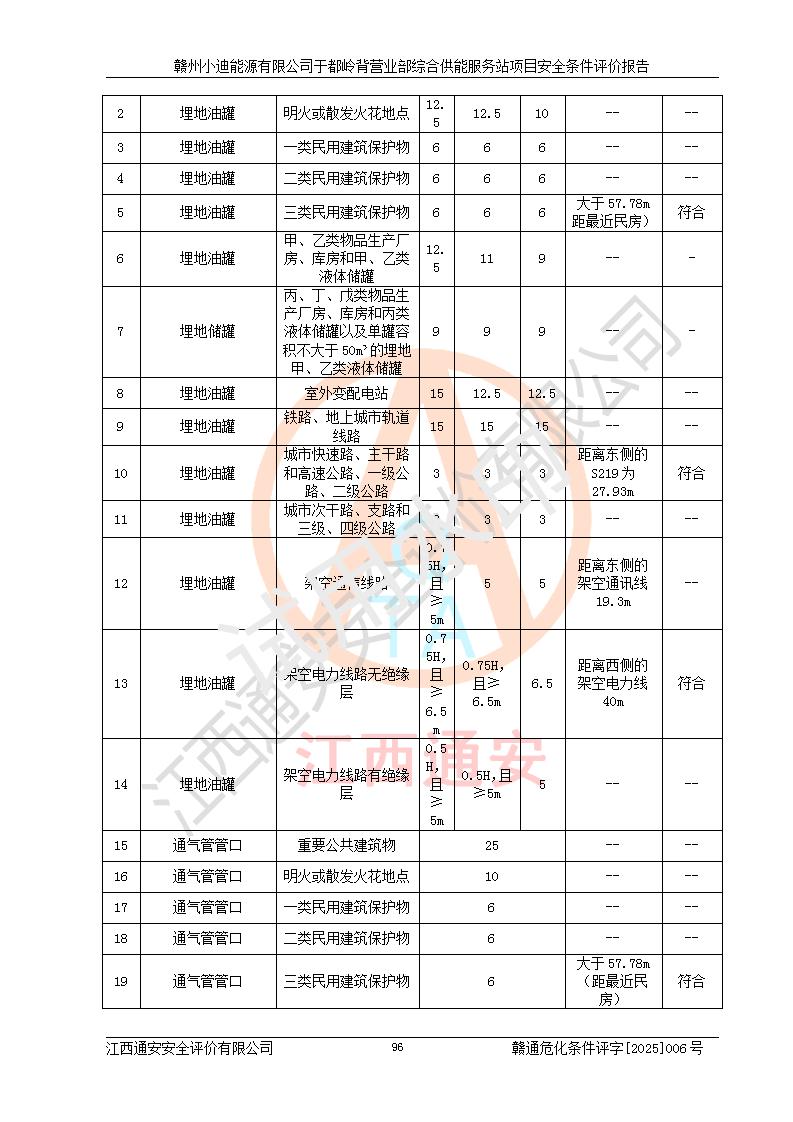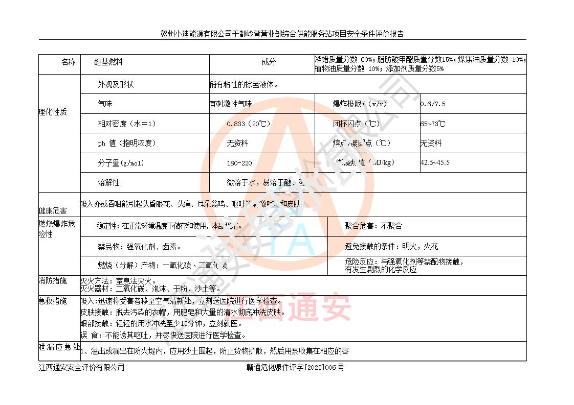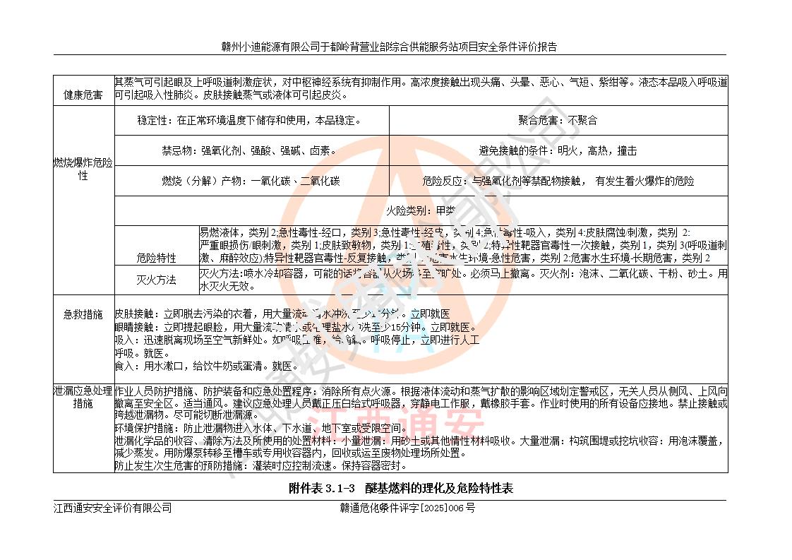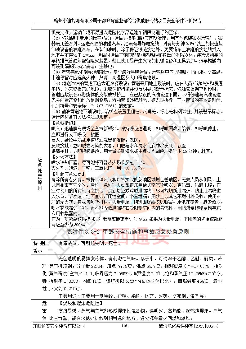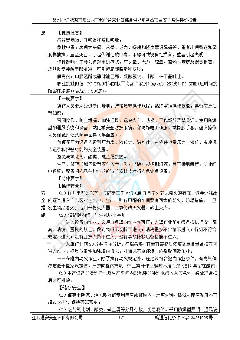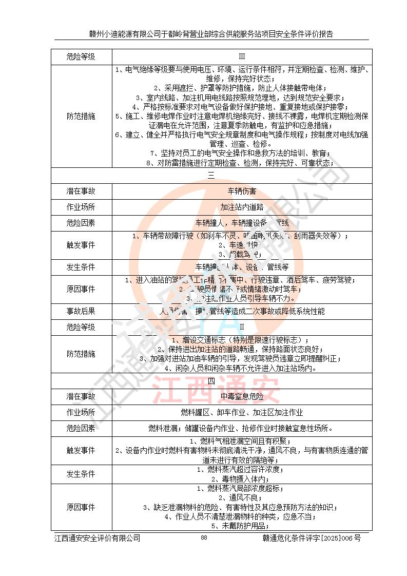一、安全狀況綜合評(píng)述 通過(guò)對(duì)本項(xiàng)目的危險(xiǎn)、有害因素分析及定性、定量評(píng)價(jià),結(jié)果為: 1)本項(xiàng)目存在的危險(xiǎn)有害因素是火災(zāi)爆炸、**傷害、高處墜落、物體打擊、觸電、機(jī)械傷害、中毒窒息、坍塌等,主要危險(xiǎn)有害因素為火災(zāi)、爆炸等危險(xiǎn)因素。需重點(diǎn)防范的危險(xiǎn)有害因素為火災(zāi)、爆炸。本項(xiàng)目未構(gòu)成危險(xiǎn)化學(xué)品重大危險(xiǎn)源,也不存在劇毒、監(jiān)控、易制毒、易制爆化學(xué)品及高毒物品,高清潔醇醚燃料主要成分甲醇和石腦油為重點(diǎn)監(jiān)管危險(xiǎn)化學(xué)品,應(yīng)按照重點(diǎn)監(jiān)管危險(xiǎn)化學(xué)品相關(guān)規(guī)定管理。 2)預(yù)先危險(xiǎn)性分析表明該加注站儲(chǔ)存、經(jīng)營(yíng)過(guò)程中火災(zāi)、爆炸、觸電的危險(xiǎn)等級(jí)為Ⅲ級(jí),**傷害、高處墜落和中毒窒息等危險(xiǎn)等級(jí)為Ⅱ級(jí)。 3)從作業(yè)條件危險(xiǎn)性分析結(jié)果可以看出,在選定的評(píng)價(jià)單元中卸液作業(yè)、加注作業(yè)、變配電作業(yè)和維修作業(yè)中卸液作業(yè)中火災(zāi)爆炸、**傷害、觸電、中毒、窒息潛在危險(xiǎn)均為一般危險(xiǎn)。 4)從危險(xiǎn)度分析結(jié)果可以看出,燃料罐區(qū)屬中度危險(xiǎn)。 5)根據(jù)選址與總平面布置安全檢查表,該加注站符合《建筑設(shè)計(jì)防火規(guī)范》GB 50016-2014(2018年版)、《汽車(chē)加油加氣加氫站技術(shù)標(biāo)準(zhǔn)》GB50156-2021及《車(chē)用甲醇燃料加注站建設(shè)規(guī)范》(工信廳節(jié)〔2015〕129號(hào))等有關(guān)標(biāo)準(zhǔn)、規(guī)范的規(guī)定。該站與站外建筑物距離符合規(guī)范要求,站外50m內(nèi)無(wú)重要建筑物和明火設(shè)施。 6)根據(jù)立項(xiàng)批文及于都縣自然資源局出具的建設(shè)用地規(guī)劃許可證,該加注站符合有關(guān)部門(mén)的審批。 7)本項(xiàng)目采用成熟的工藝設(shè)備,項(xiàng)目在嚴(yán)格按照**相關(guān)法律、法規(guī)及技術(shù)標(biāo)準(zhǔn)制造、安裝、檢測(cè)檢驗(yàn)的情況下,其安全生產(chǎn)風(fēng)險(xiǎn)程度在可接受范圍。 8)本項(xiàng)目危害物質(zhì)為高清潔醇醚燃料(車(chē)用D型,甲類(lèi))和醚基燃料(車(chē)用Y型,丙類(lèi)),應(yīng)重點(diǎn)注意火災(zāi)、爆炸危害,做好防火防靜電措施。**加注站罐區(qū)、加注區(qū)無(wú)明火產(chǎn)生;卸液口應(yīng)設(shè)置防靜電報(bào)警器,罐區(qū)法蘭應(yīng)跨接,防止靜電引起火災(zāi)爆炸事故。 四、評(píng)價(jià)結(jié)論 贛州小迪能源有限公司于都嶺背營(yíng)業(yè)部綜合供能服務(wù)站項(xiàng)目總平面布置符合相關(guān)規(guī)范的要求。在項(xiàng)目建設(shè)和運(yùn)行階段,總平面布置設(shè)計(jì)、施工圖設(shè)計(jì)和建設(shè)施工、安裝調(diào)試及生產(chǎn)運(yùn)行中,應(yīng)嚴(yán)格執(zhí)行**有關(guān)安全生產(chǎn)法律、法規(guī)和有關(guān)標(biāo)準(zhǔn)、規(guī)范,將本報(bào)告中提出的安全對(duì)策措施落實(shí)到位,真正做到安全設(shè)施與主體工程同時(shí)設(shè)計(jì)、同時(shí)施工、同時(shí)投入生產(chǎn)和使用,項(xiàng)目建成后危險(xiǎn)、有害因素可以得到**控制,安全風(fēng)險(xiǎn)在可接受范圍,擬建的贛州小迪能源有限公司于都嶺背營(yíng)業(yè)部綜合供能服務(wù)站項(xiàng)目符合法律法規(guī)、標(biāo)準(zhǔn)、規(guī)章和規(guī)范的要求。 |