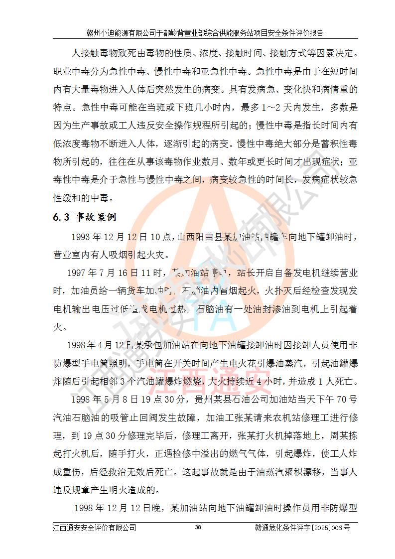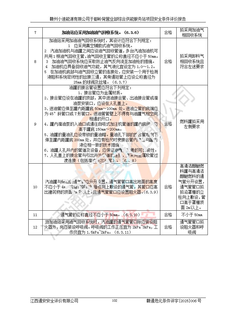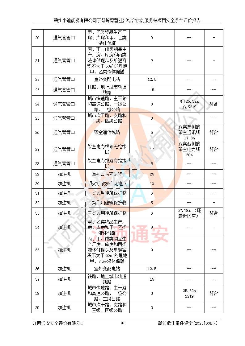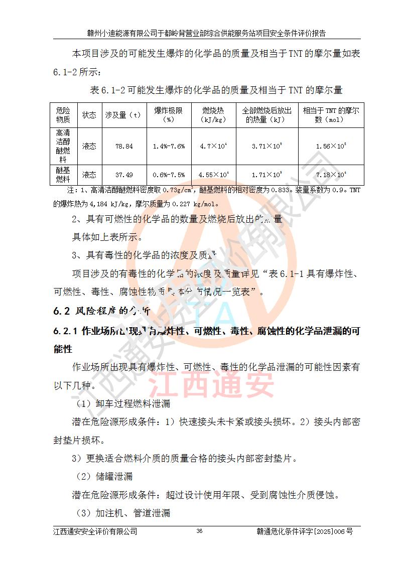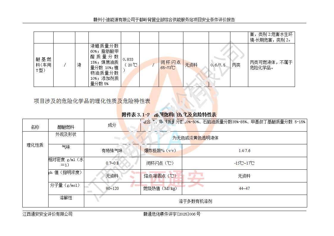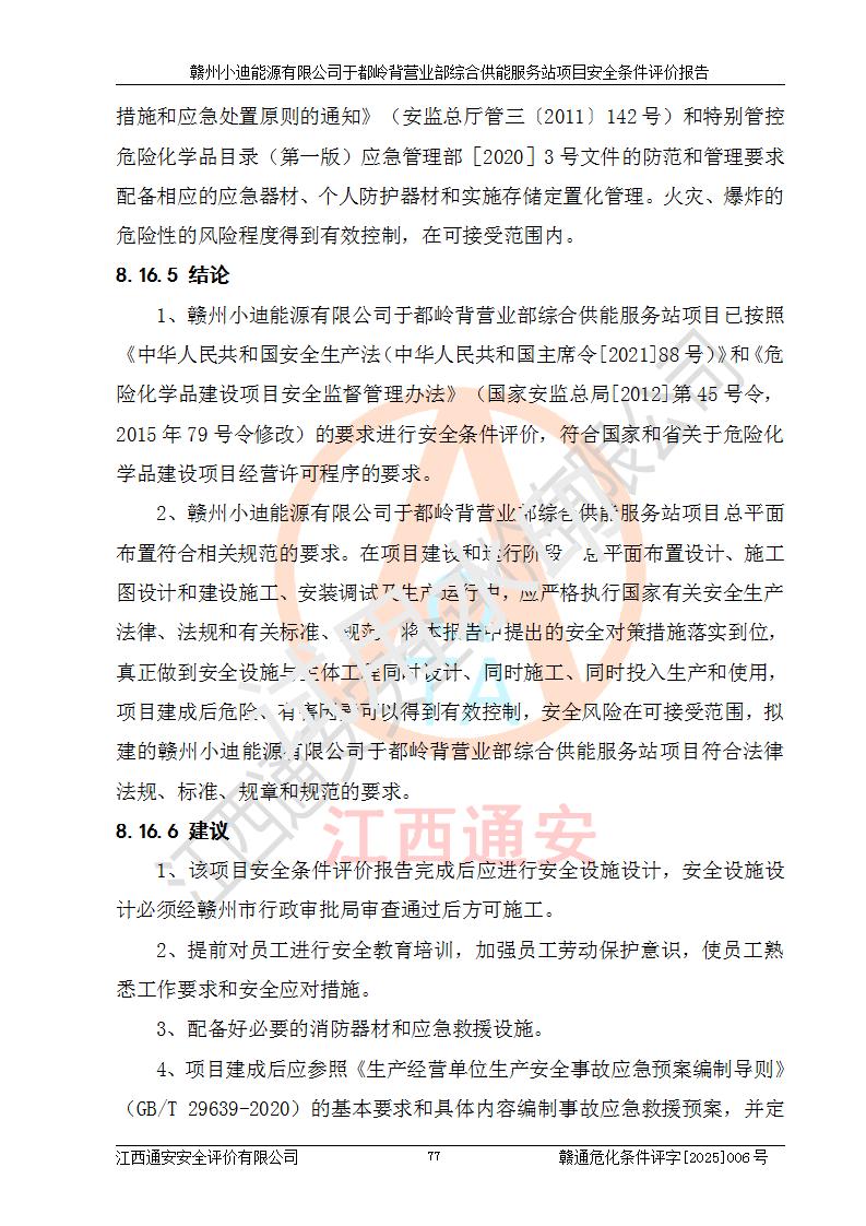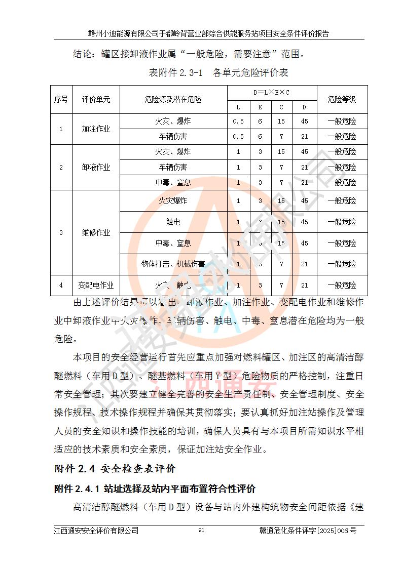 一、安全狀況綜合評(píng)述 通過(guò)對(duì)本項(xiàng)目的危險(xiǎn)、有害因素分析及定性、定量評(píng)價(jià),結(jié)果為: 1)本項(xiàng)目存在的危險(xiǎn)有害因素是火災(zāi)爆炸、**傷害、高處墜落、物體打擊、觸電、機(jī)械傷害、中毒窒息、坍塌等,主要危險(xiǎn)有害因素為火災(zāi)、爆炸等危險(xiǎn)因素。需重點(diǎn)防范的危險(xiǎn)有害因素為火災(zāi)、爆炸。本項(xiàng)目未構(gòu)成危險(xiǎn)化學(xué)品重大危險(xiǎn)源,也不存在劇毒、監(jiān)控、易制毒、易制爆化學(xué)品及高毒物品,高清潔醇醚燃料主要成分甲醇和石腦油為重點(diǎn)監(jiān)管危險(xiǎn)化學(xué)品,應(yīng)按照重點(diǎn)監(jiān)管危險(xiǎn)化學(xué)品相關(guān)規(guī)定管理。 2)預(yù)先危險(xiǎn)性分析表明該加注站儲(chǔ)存、經(jīng)營(yíng)過(guò)程中火災(zāi)、爆炸、觸電的危險(xiǎn)等級(jí)為Ⅲ級(jí),**傷害、高處墜落和中毒窒息等危險(xiǎn)等級(jí)為Ⅱ級(jí)。 3)從作業(yè)條件危險(xiǎn)性分析結(jié)果可以看出,在選定的評(píng)價(jià)單元中卸液作業(yè)、加注作業(yè)、變配電作業(yè)和維修作業(yè)中卸液作業(yè)中火災(zāi)爆炸、**傷害、觸電、中毒、窒息潛在危險(xiǎn)均為一般危險(xiǎn)。 4)從危險(xiǎn)度分析結(jié)果可以看出,燃料罐區(qū)屬中度危險(xiǎn)。 5)根據(jù)選址與總平面布置安全檢查表,該加注站符合《建筑設(shè)計(jì)防火規(guī)范》GB 50016-2014(2018年版)、《汽車(chē)加油加氣加氫站技術(shù)標(biāo)準(zhǔn)》GB50156-2021及《車(chē)用甲醇燃料加注站建設(shè)規(guī)范》(工信廳節(jié)〔2015〕129號(hào))等有關(guān)標(biāo)準(zhǔn)、規(guī)范的規(guī)定。該站與站外建筑物距離符合規(guī)范要求,站外50m內(nèi)無(wú)重要建筑物和明火設(shè)施。 6)根據(jù)立項(xiàng)批文及于都縣自然資源局出具的建設(shè)用地規(guī)劃許可證,該加注站符合有關(guān)部門(mén)的審批。 7)本項(xiàng)目采用成熟的工藝設(shè)備,項(xiàng)目在嚴(yán)格按照**相關(guān)法律、法規(guī)及技術(shù)標(biāo)準(zhǔn)制造、安裝、檢測(cè)檢驗(yàn)的情況下,其安全生產(chǎn)風(fēng)險(xiǎn)程度在可接受范圍。 8)本項(xiàng)目危害物質(zhì)為高清潔醇醚燃料(車(chē)用D型,甲類(lèi))和醚基燃料(車(chē)用Y型,丙類(lèi)),應(yīng)重點(diǎn)注意火災(zāi)、爆炸危害,做好防火防靜電措施。**加注站罐區(qū)、加注區(qū)無(wú)明火產(chǎn)生;卸液口應(yīng)設(shè)置防靜電報(bào)警器,罐區(qū)法蘭應(yīng)跨接,防止靜電引起火災(zāi)爆炸事故。 四、評(píng)價(jià)結(jié)論 贛州小迪能源有限公司于都嶺背營(yíng)業(yè)部綜合供能服務(wù)站項(xiàng)目總平面布置符合相關(guān)規(guī)范的要求。在項(xiàng)目建設(shè)和運(yùn)行階段,總平面布置設(shè)計(jì)、施工圖設(shè)計(jì)和建設(shè)施工、安裝調(diào)試及生產(chǎn)運(yùn)行中,應(yīng)嚴(yán)格執(zhí)行**有關(guān)安全生產(chǎn)法律、法規(guī)和有關(guān)標(biāo)準(zhǔn)、規(guī)范,將本報(bào)告中提出的安全對(duì)策措施落實(shí)到位,真正做到安全設(shè)施與主體工程同時(shí)設(shè)計(jì)、同時(shí)施工、同時(shí)投入生產(chǎn)和使用,項(xiàng)目建成后危險(xiǎn)、有害因素可以得到**控制,安全風(fēng)險(xiǎn)在可接受范圍,擬建的贛州小迪能源有限公司于都嶺背營(yíng)業(yè)部綜合供能服務(wù)站項(xiàng)目符合法律法規(guī)、標(biāo)準(zhǔn)、規(guī)章和規(guī)范的要求。 |