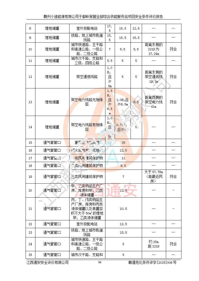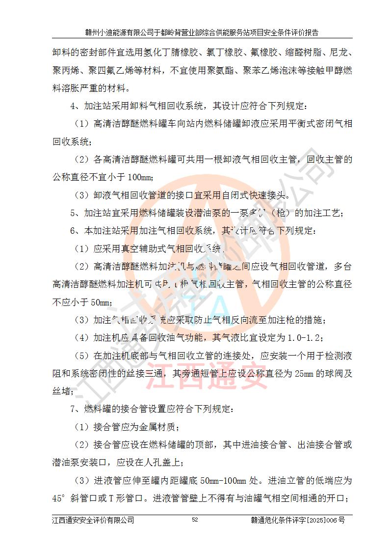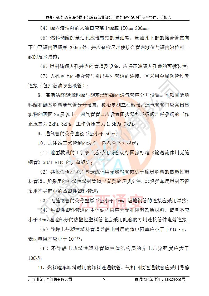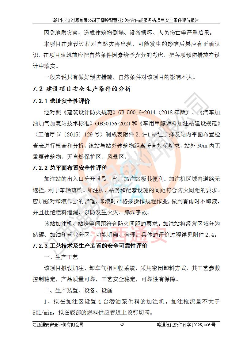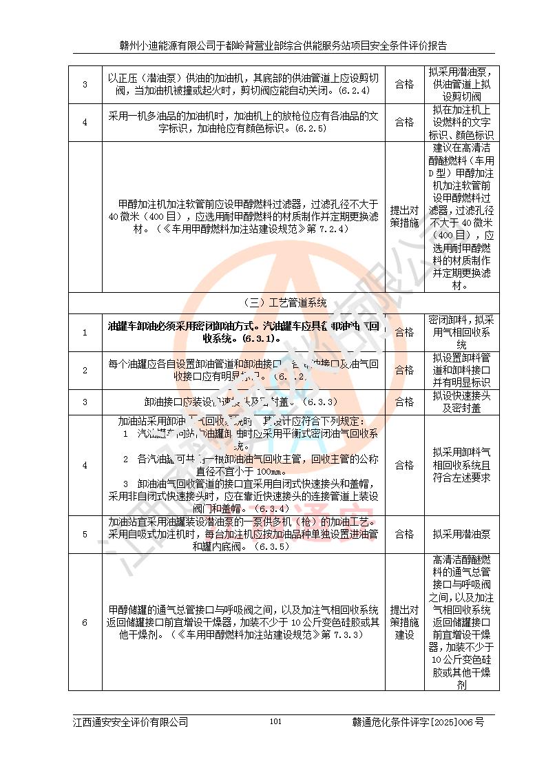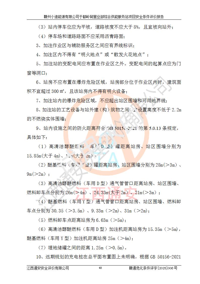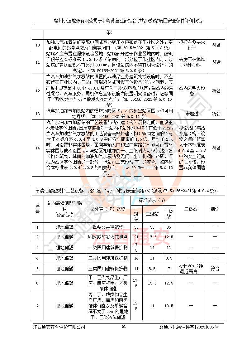 一、安全狀況綜合評(píng)述 通過(guò)對(duì)本項(xiàng)目的危險(xiǎn)、有害因素分析及定性、定量評(píng)價(jià),結(jié)果為: 1)本項(xiàng)目存在的危險(xiǎn)有害因素是火災(zāi)爆炸、**傷害、高處墜落、物體打擊、觸電、機(jī)械傷害、中毒窒息、坍塌等,主要危險(xiǎn)有害因素為火災(zāi)、爆炸等危險(xiǎn)因素。需重點(diǎn)防范的危險(xiǎn)有害因素為火災(zāi)、爆炸。本項(xiàng)目未構(gòu)成危險(xiǎn)化學(xué)品重大危險(xiǎn)源,也不存在劇毒、監(jiān)控、易制毒、易制爆化學(xué)品及高毒物品,高清潔醇醚燃料主要成分甲醇和石腦油為重點(diǎn)監(jiān)管危險(xiǎn)化學(xué)品,應(yīng)按照重點(diǎn)監(jiān)管危險(xiǎn)化學(xué)品相關(guān)規(guī)定管理。 2)預(yù)先危險(xiǎn)性分析表明該加注站儲(chǔ)存、經(jīng)營(yíng)過(guò)程中火災(zāi)、爆炸、觸電的危險(xiǎn)等級(jí)為Ⅲ級(jí),**傷害、高處墜落和中毒窒息等危險(xiǎn)等級(jí)為Ⅱ級(jí)。 3)從作業(yè)條件危險(xiǎn)性分析結(jié)果可以看出,在選定的評(píng)價(jià)單元中卸液作業(yè)、加注作業(yè)、變配電作業(yè)和維修作業(yè)中卸液作業(yè)中火災(zāi)爆炸、**傷害、觸電、中毒、窒息潛在危險(xiǎn)均為一般危險(xiǎn)。 4)從危險(xiǎn)度分析結(jié)果可以看出,燃料罐區(qū)屬中度危險(xiǎn)。 5)根據(jù)選址與總平面布置安全檢查表,該加注站符合《建筑設(shè)計(jì)防火規(guī)范》GB 50016-2014(2018年版)、《汽車(chē)加油加氣加氫站技術(shù)標(biāo)準(zhǔn)》GB50156-2021及《車(chē)用甲醇燃料加注站建設(shè)規(guī)范》(工信廳節(jié)〔2015〕129號(hào))等有關(guān)標(biāo)準(zhǔn)、規(guī)范的規(guī)定。該站與站外建筑物距離符合規(guī)范要求,站外50m內(nèi)無(wú)重要建筑物和明火設(shè)施。 6)根據(jù)立項(xiàng)批文及于都縣自然資源局出具的建設(shè)用地規(guī)劃許可證,該加注站符合有關(guān)部門(mén)的審批。 7)本項(xiàng)目采用成熟的工藝設(shè)備,項(xiàng)目在嚴(yán)格按照**相關(guān)法律、法規(guī)及技術(shù)標(biāo)準(zhǔn)制造、安裝、檢測(cè)檢驗(yàn)的情況下,其安全生產(chǎn)風(fēng)險(xiǎn)程度在可接受范圍。 8)本項(xiàng)目危害物質(zhì)為高清潔醇醚燃料(車(chē)用D型,甲類(lèi))和醚基燃料(車(chē)用Y型,丙類(lèi)),應(yīng)重點(diǎn)注意火災(zāi)、爆炸危害,做好防火防靜電措施。**加注站罐區(qū)、加注區(qū)無(wú)明火產(chǎn)生;卸液口應(yīng)設(shè)置防靜電報(bào)警器,罐區(qū)法蘭應(yīng)跨接,防止靜電引起火災(zāi)爆炸事故。 四、評(píng)價(jià)結(jié)論 贛州小迪能源有限公司于都嶺背營(yíng)業(yè)部綜合供能服務(wù)站項(xiàng)目總平面布置符合相關(guān)規(guī)范的要求。在項(xiàng)目建設(shè)和運(yùn)行階段,總平面布置設(shè)計(jì)、施工圖設(shè)計(jì)和建設(shè)施工、安裝調(diào)試及生產(chǎn)運(yùn)行中,應(yīng)嚴(yán)格執(zhí)行**有關(guān)安全生產(chǎn)法律、法規(guī)和有關(guān)標(biāo)準(zhǔn)、規(guī)范,將本報(bào)告中提出的安全對(duì)策措施落實(shí)到位,真正做到安全設(shè)施與主體工程同時(shí)設(shè)計(jì)、同時(shí)施工、同時(shí)投入生產(chǎn)和使用,項(xiàng)目建成后危險(xiǎn)、有害因素可以得到**控制,安全風(fēng)險(xiǎn)在可接受范圍,擬建的贛州小迪能源有限公司于都嶺背營(yíng)業(yè)部綜合供能服務(wù)站項(xiàng)目符合法律法規(guī)、標(biāo)準(zhǔn)、規(guī)章和規(guī)范的要求。 |