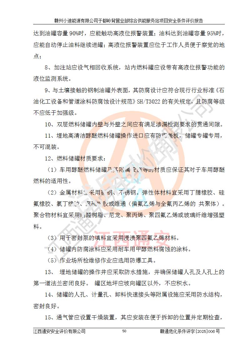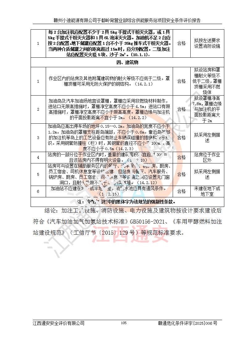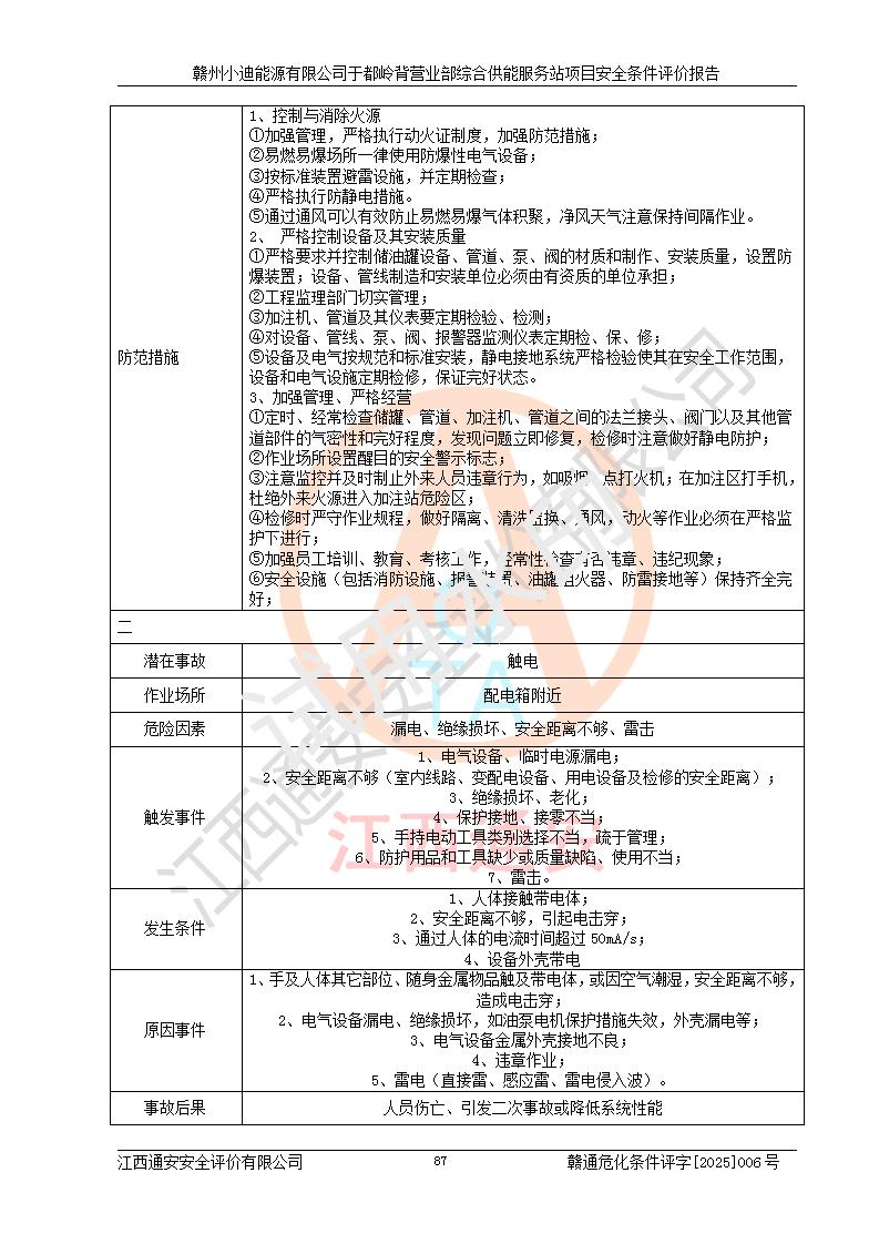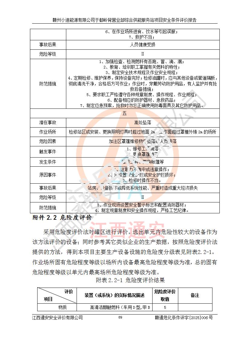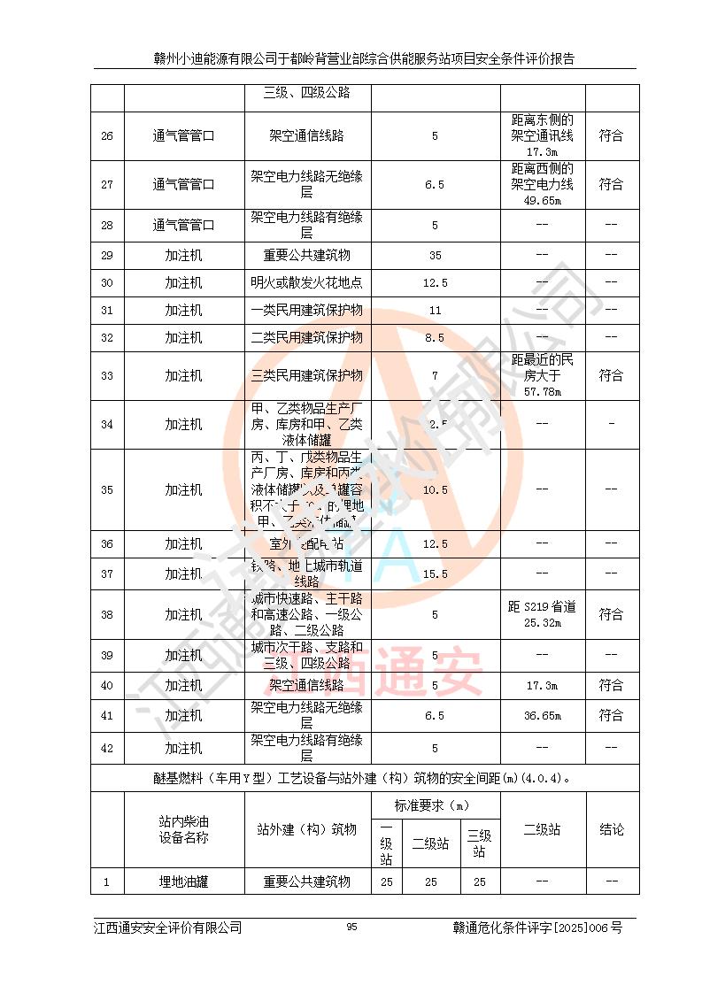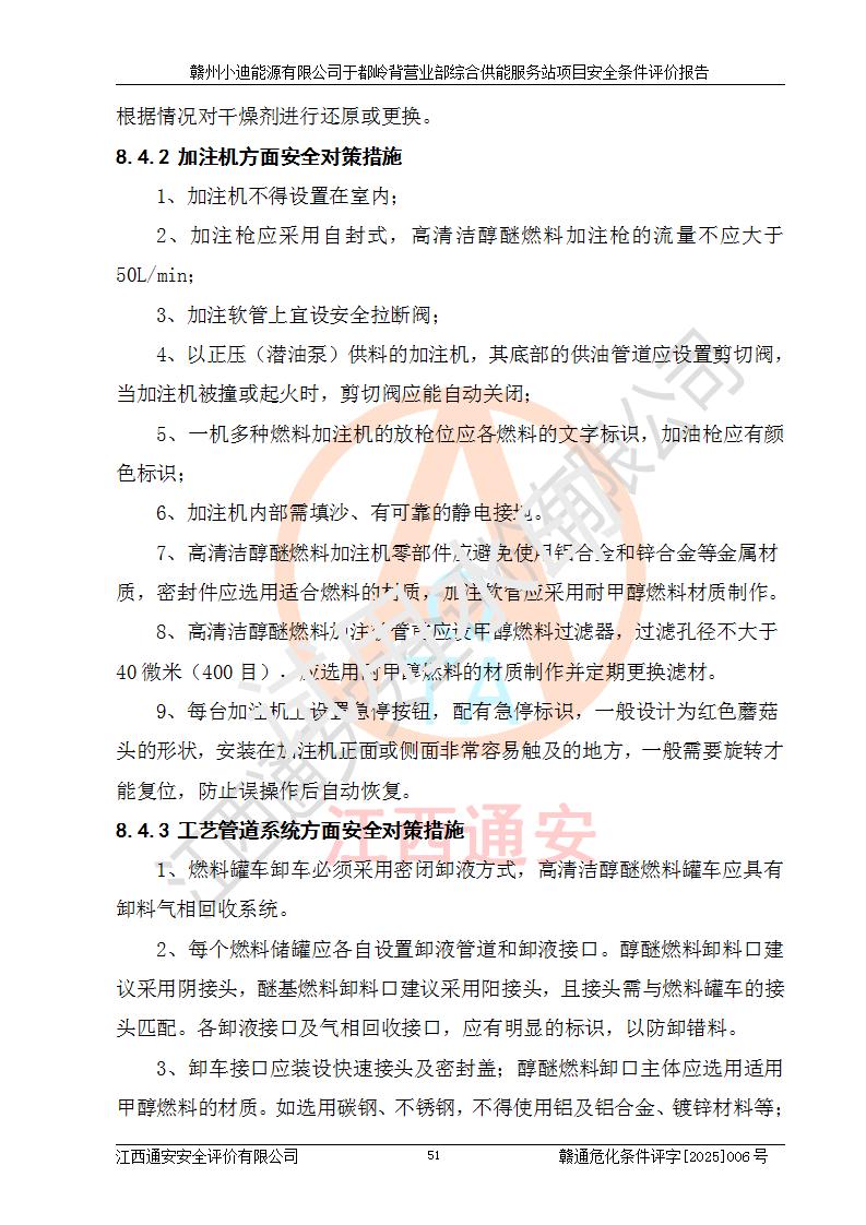 一、安全狀況綜合評(píng)述 通過(guò)對(duì)本項(xiàng)目的危險(xiǎn)、有害因素分析及定性、定量評(píng)價(jià),結(jié)果為: 1)本項(xiàng)目存在的危險(xiǎn)有害因素是火災(zāi)爆炸、**傷害、高處墜落、物體打擊、觸電、機(jī)械傷害、中毒窒息、坍塌等,主要危險(xiǎn)有害因素為火災(zāi)、爆炸等危險(xiǎn)因素。需重點(diǎn)防范的危險(xiǎn)有害因素為火災(zāi)、爆炸。本項(xiàng)目未構(gòu)成危險(xiǎn)化學(xué)品重大危險(xiǎn)源,也不存在劇毒、監(jiān)控、易制毒、易制爆化學(xué)品及高毒物品,高清潔醇醚燃料主要成分甲醇和石腦油為重點(diǎn)監(jiān)管危險(xiǎn)化學(xué)品,應(yīng)按照重點(diǎn)監(jiān)管危險(xiǎn)化學(xué)品相關(guān)規(guī)定管理。 2)預(yù)先危險(xiǎn)性分析表明該加注站儲(chǔ)存、經(jīng)營(yíng)過(guò)程中火災(zāi)、爆炸、觸電的危險(xiǎn)等級(jí)為Ⅲ級(jí),**傷害、高處墜落和中毒窒息等危險(xiǎn)等級(jí)為Ⅱ級(jí)。 3)從作業(yè)條件危險(xiǎn)性分析結(jié)果可以看出,在選定的評(píng)價(jià)單元中卸液作業(yè)、加注作業(yè)、變配電作業(yè)和維修作業(yè)中卸液作業(yè)中火災(zāi)爆炸、**傷害、觸電、中毒、窒息潛在危險(xiǎn)均為一般危險(xiǎn)。 4)從危險(xiǎn)度分析結(jié)果可以看出,燃料罐區(qū)屬中度危險(xiǎn)。 5)根據(jù)選址與總平面布置安全檢查表,該加注站符合《建筑設(shè)計(jì)防火規(guī)范》GB 50016-2014(2018年版)、《汽車(chē)加油加氣加氫站技術(shù)標(biāo)準(zhǔn)》GB50156-2021及《車(chē)用甲醇燃料加注站建設(shè)規(guī)范》(工信廳節(jié)〔2015〕129號(hào))等有關(guān)標(biāo)準(zhǔn)、規(guī)范的規(guī)定。該站與站外建筑物距離符合規(guī)范要求,站外50m內(nèi)無(wú)重要建筑物和明火設(shè)施。 6)根據(jù)立項(xiàng)批文及于都縣自然資源局出具的建設(shè)用地規(guī)劃許可證,該加注站符合有關(guān)部門(mén)的審批。 7)本項(xiàng)目采用成熟的工藝設(shè)備,項(xiàng)目在嚴(yán)格按照**相關(guān)法律、法規(guī)及技術(shù)標(biāo)準(zhǔn)制造、安裝、檢測(cè)檢驗(yàn)的情況下,其安全生產(chǎn)風(fēng)險(xiǎn)程度在可接受范圍。 8)本項(xiàng)目危害物質(zhì)為高清潔醇醚燃料(車(chē)用D型,甲類(lèi))和醚基燃料(車(chē)用Y型,丙類(lèi)),應(yīng)重點(diǎn)注意火災(zāi)、爆炸危害,做好防火防靜電措施。**加注站罐區(qū)、加注區(qū)無(wú)明火產(chǎn)生;卸液口應(yīng)設(shè)置防靜電報(bào)警器,罐區(qū)法蘭應(yīng)跨接,防止靜電引起火災(zāi)爆炸事故。 四、評(píng)價(jià)結(jié)論 贛州小迪能源有限公司于都嶺背營(yíng)業(yè)部綜合供能服務(wù)站項(xiàng)目總平面布置符合相關(guān)規(guī)范的要求。在項(xiàng)目建設(shè)和運(yùn)行階段,總平面布置設(shè)計(jì)、施工圖設(shè)計(jì)和建設(shè)施工、安裝調(diào)試及生產(chǎn)運(yùn)行中,應(yīng)嚴(yán)格執(zhí)行**有關(guān)安全生產(chǎn)法律、法規(guī)和有關(guān)標(biāo)準(zhǔn)、規(guī)范,將本報(bào)告中提出的安全對(duì)策措施落實(shí)到位,真正做到安全設(shè)施與主體工程同時(shí)設(shè)計(jì)、同時(shí)施工、同時(shí)投入生產(chǎn)和使用,項(xiàng)目建成后危險(xiǎn)、有害因素可以得到**控制,安全風(fēng)險(xiǎn)在可接受范圍,擬建的贛州小迪能源有限公司于都嶺背營(yíng)業(yè)部綜合供能服務(wù)站項(xiàng)目符合法律法規(guī)、標(biāo)準(zhǔn)、規(guī)章和規(guī)范的要求。 |