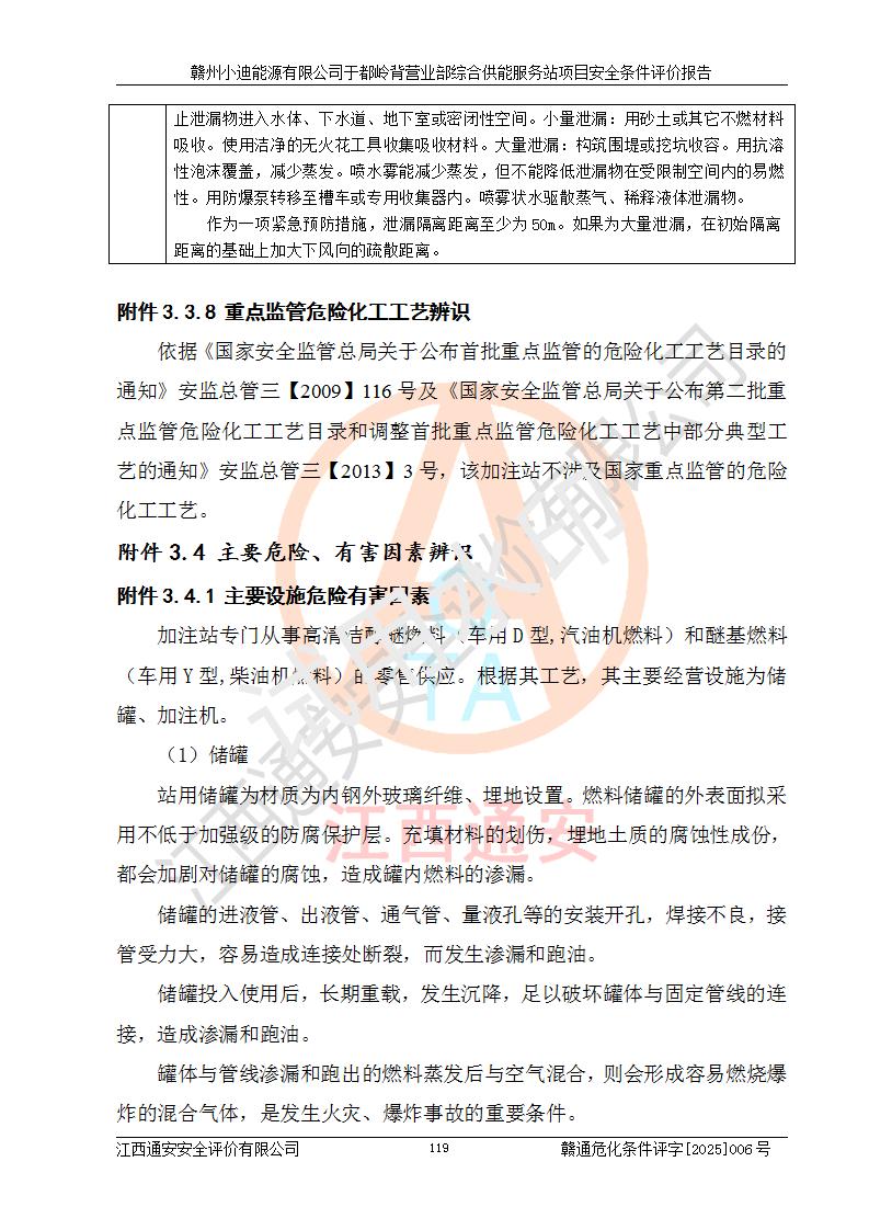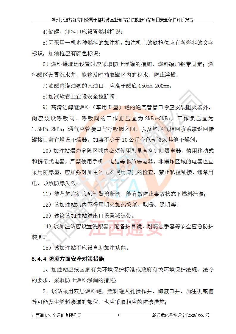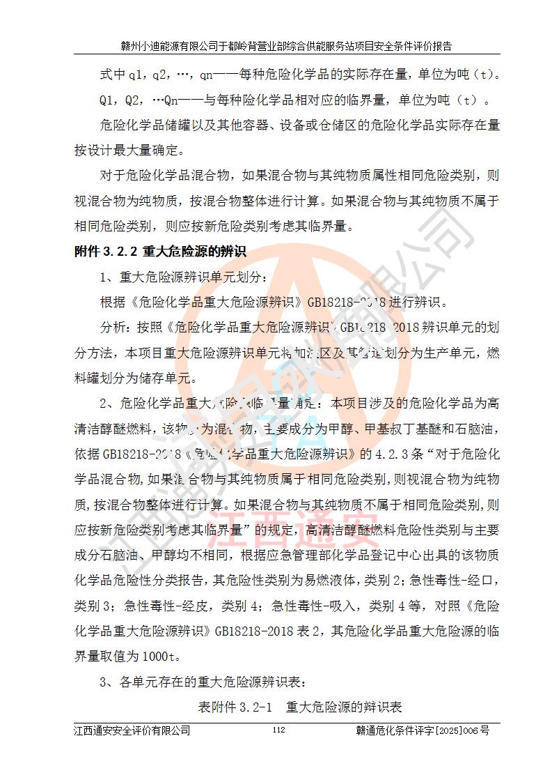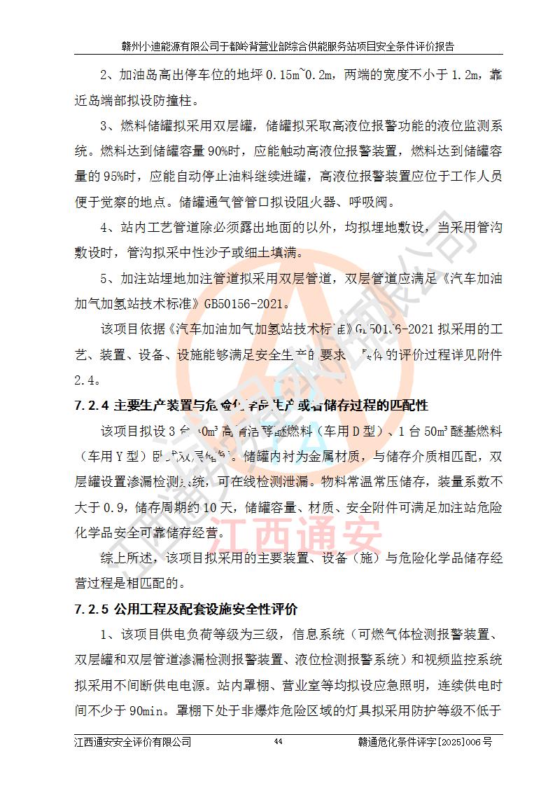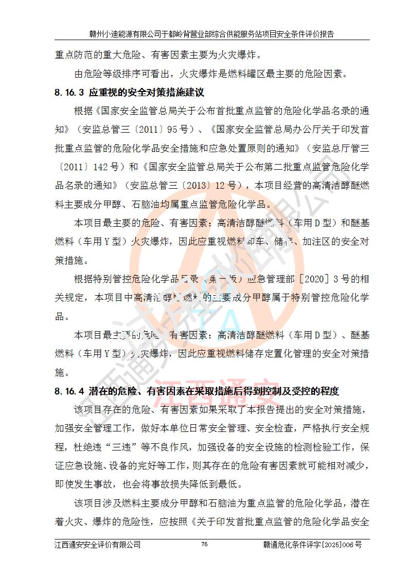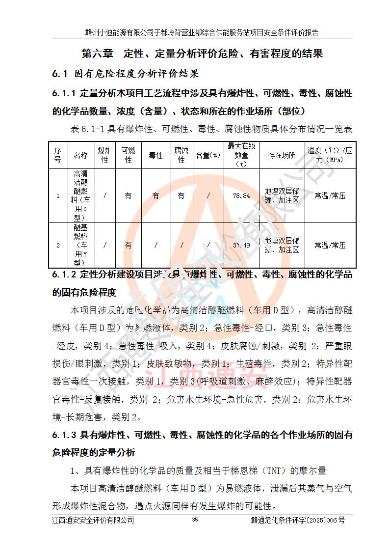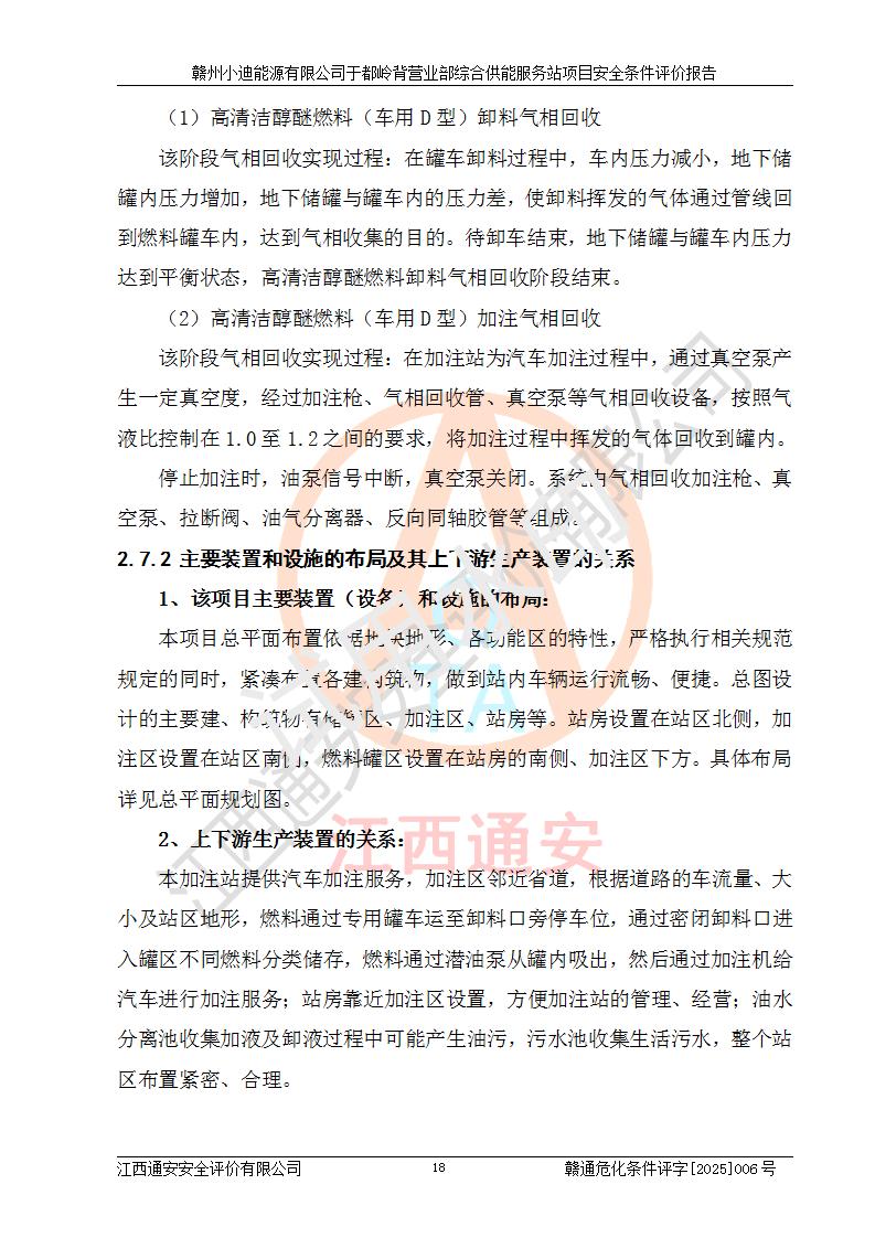 一、安全狀況綜合評(píng)述 通過(guò)對(duì)本項(xiàng)目的危險(xiǎn)、有害因素分析及定性、定量評(píng)價(jià),結(jié)果為: 1)本項(xiàng)目存在的危險(xiǎn)有害因素是火災(zāi)爆炸、**傷害、高處墜落、物體打擊、觸電、機(jī)械傷害、中毒窒息、坍塌等,主要危險(xiǎn)有害因素為火災(zāi)、爆炸等危險(xiǎn)因素。需重點(diǎn)防范的危險(xiǎn)有害因素為火災(zāi)、爆炸。本項(xiàng)目未構(gòu)成危險(xiǎn)化學(xué)品重大危險(xiǎn)源,也不存在劇毒、監(jiān)控、易制毒、易制爆化學(xué)品及高毒物品,高清潔醇醚燃料主要成分甲醇和石腦油為重點(diǎn)監(jiān)管危險(xiǎn)化學(xué)品,應(yīng)按照重點(diǎn)監(jiān)管危險(xiǎn)化學(xué)品相關(guān)規(guī)定管理。 2)預(yù)先危險(xiǎn)性分析表明該加注站儲(chǔ)存、經(jīng)營(yíng)過(guò)程中火災(zāi)、爆炸、觸電的危險(xiǎn)等級(jí)為Ⅲ級(jí),**傷害、高處墜落和中毒窒息等危險(xiǎn)等級(jí)為Ⅱ級(jí)。 3)從作業(yè)條件危險(xiǎn)性分析結(jié)果可以看出,在選定的評(píng)價(jià)單元中卸液作業(yè)、加注作業(yè)、變配電作業(yè)和維修作業(yè)中卸液作業(yè)中火災(zāi)爆炸、**傷害、觸電、中毒、窒息潛在危險(xiǎn)均為一般危險(xiǎn)。 4)從危險(xiǎn)度分析結(jié)果可以看出,燃料罐區(qū)屬中度危險(xiǎn)。 5)根據(jù)選址與總平面布置安全檢查表,該加注站符合《建筑設(shè)計(jì)防火規(guī)范》GB 50016-2014(2018年版)、《汽車(chē)加油加氣加氫站技術(shù)標(biāo)準(zhǔn)》GB50156-2021及《車(chē)用甲醇燃料加注站建設(shè)規(guī)范》(工信廳節(jié)〔2015〕129號(hào))等有關(guān)標(biāo)準(zhǔn)、規(guī)范的規(guī)定。該站與站外建筑物距離符合規(guī)范要求,站外50m內(nèi)無(wú)重要建筑物和明火設(shè)施。 6)根據(jù)立項(xiàng)批文及于都縣自然資源局出具的建設(shè)用地規(guī)劃許可證,該加注站符合有關(guān)部門(mén)的審批。 7)本項(xiàng)目采用成熟的工藝設(shè)備,項(xiàng)目在嚴(yán)格按照**相關(guān)法律、法規(guī)及技術(shù)標(biāo)準(zhǔn)制造、安裝、檢測(cè)檢驗(yàn)的情況下,其安全生產(chǎn)風(fēng)險(xiǎn)程度在可接受范圍。 8)本項(xiàng)目危害物質(zhì)為高清潔醇醚燃料(車(chē)用D型,甲類(lèi))和醚基燃料(車(chē)用Y型,丙類(lèi)),應(yīng)重點(diǎn)注意火災(zāi)、爆炸危害,做好防火防靜電措施。**加注站罐區(qū)、加注區(qū)無(wú)明火產(chǎn)生;卸液口應(yīng)設(shè)置防靜電報(bào)警器,罐區(qū)法蘭應(yīng)跨接,防止靜電引起火災(zāi)爆炸事故。 四、評(píng)價(jià)結(jié)論 贛州小迪能源有限公司于都嶺背營(yíng)業(yè)部綜合供能服務(wù)站項(xiàng)目總平面布置符合相關(guān)規(guī)范的要求。在項(xiàng)目建設(shè)和運(yùn)行階段,總平面布置設(shè)計(jì)、施工圖設(shè)計(jì)和建設(shè)施工、安裝調(diào)試及生產(chǎn)運(yùn)行中,應(yīng)嚴(yán)格執(zhí)行**有關(guān)安全生產(chǎn)法律、法規(guī)和有關(guān)標(biāo)準(zhǔn)、規(guī)范,將本報(bào)告中提出的安全對(duì)策措施落實(shí)到位,真正做到安全設(shè)施與主體工程同時(shí)設(shè)計(jì)、同時(shí)施工、同時(shí)投入生產(chǎn)和使用,項(xiàng)目建成后危險(xiǎn)、有害因素可以得到**控制,安全風(fēng)險(xiǎn)在可接受范圍,擬建的贛州小迪能源有限公司于都嶺背營(yíng)業(yè)部綜合供能服務(wù)站項(xiàng)目符合法律法規(guī)、標(biāo)準(zhǔn)、規(guī)章和規(guī)范的要求。 |