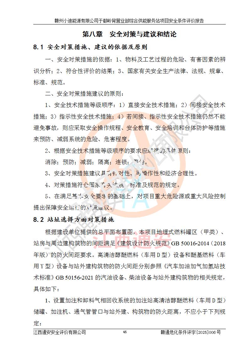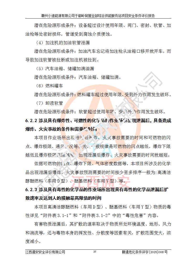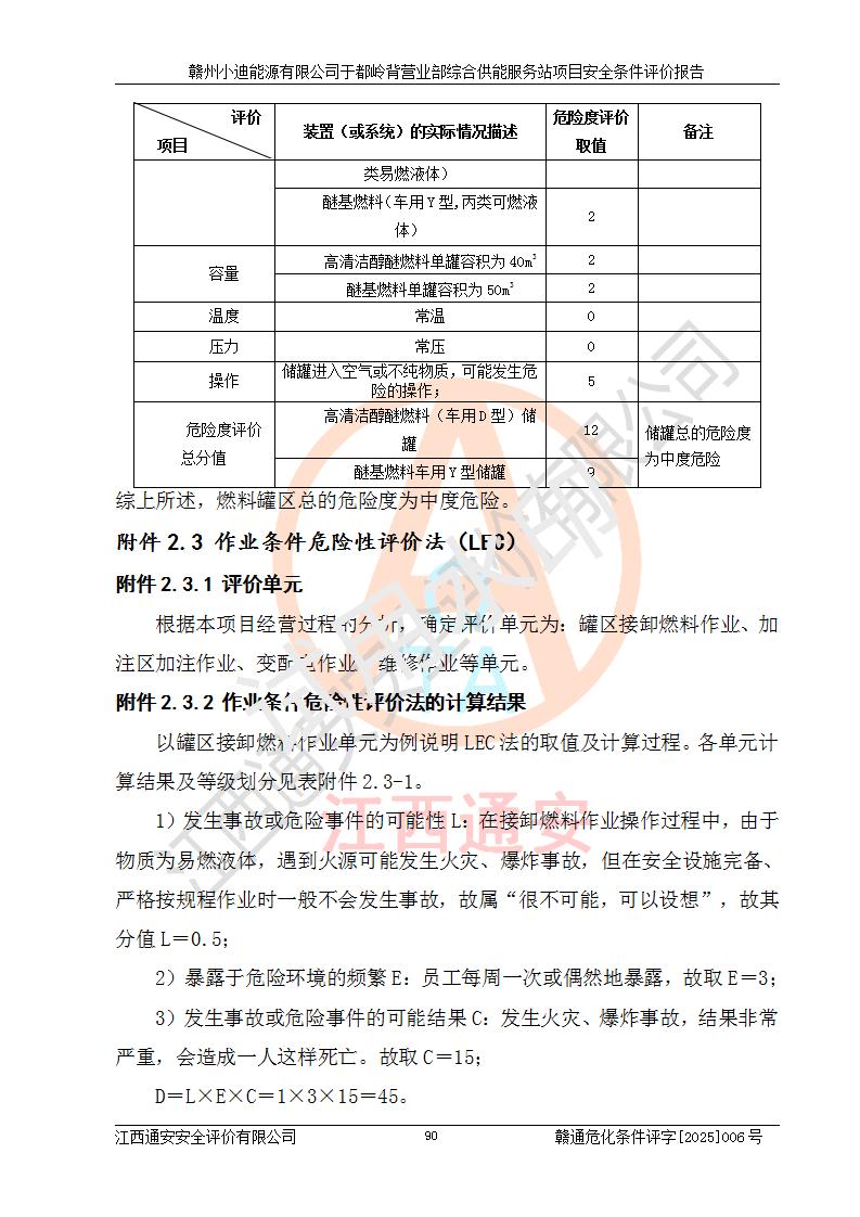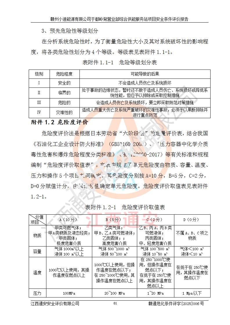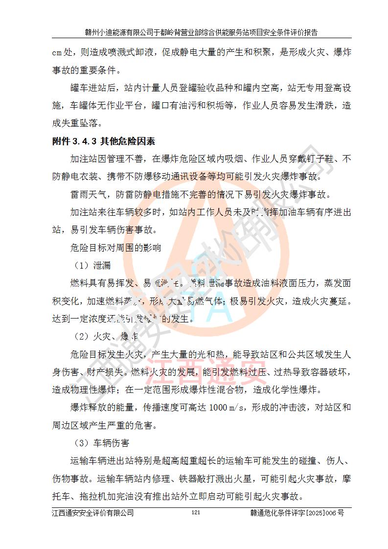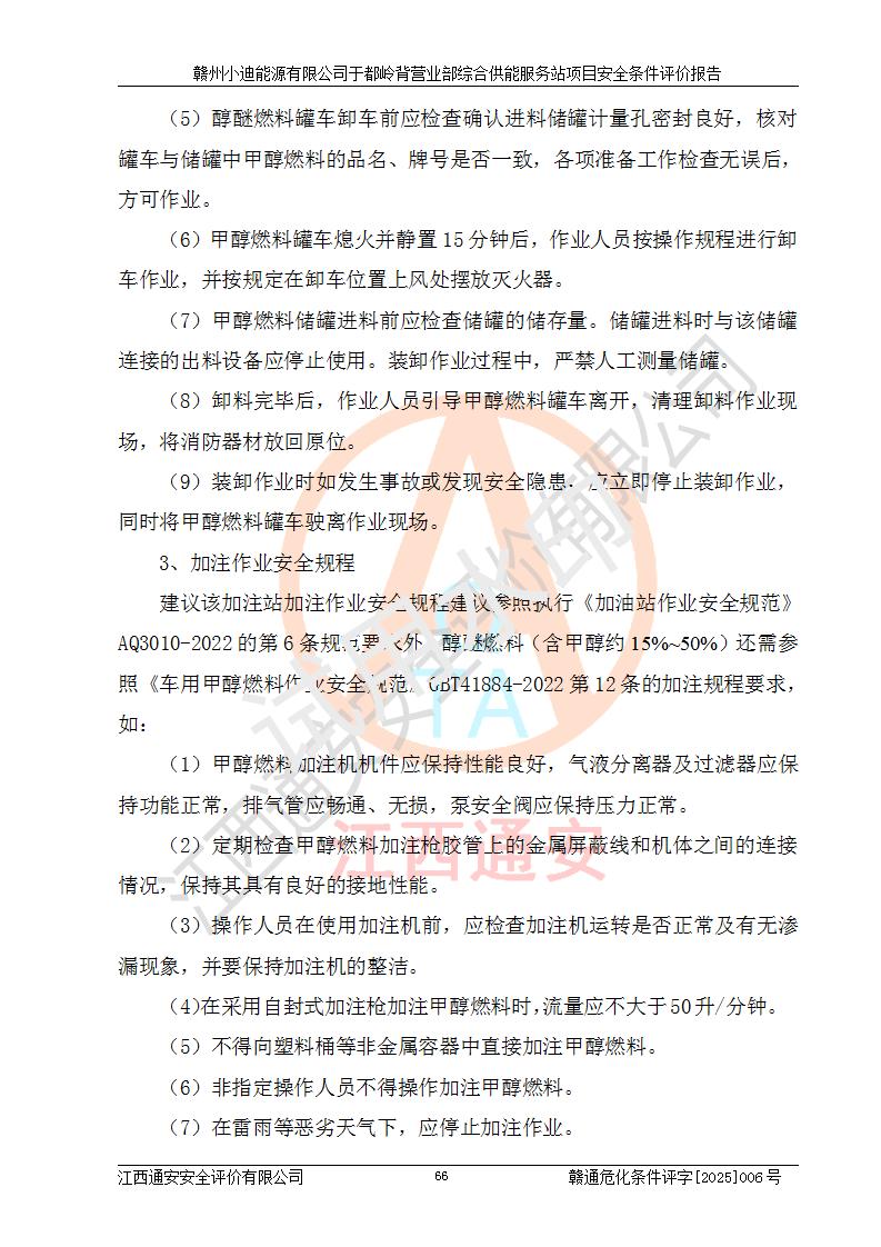 一、安全狀況綜合評(píng)述 通過(guò)對(duì)本項(xiàng)目的危險(xiǎn)、有害因素分析及定性、定量評(píng)價(jià),結(jié)果為: 1)本項(xiàng)目存在的危險(xiǎn)有害因素是火災(zāi)爆炸、**傷害、高處墜落、物體打擊、觸電、機(jī)械傷害、中毒窒息、坍塌等,主要危險(xiǎn)有害因素為火災(zāi)、爆炸等危險(xiǎn)因素。需重點(diǎn)防范的危險(xiǎn)有害因素為火災(zāi)、爆炸。本項(xiàng)目未構(gòu)成危險(xiǎn)化學(xué)品重大危險(xiǎn)源,也不存在劇毒、監(jiān)控、易制毒、易制爆化學(xué)品及高毒物品,高清潔醇醚燃料主要成分甲醇和石腦油為重點(diǎn)監(jiān)管危險(xiǎn)化學(xué)品,應(yīng)按照重點(diǎn)監(jiān)管危險(xiǎn)化學(xué)品相關(guān)規(guī)定管理。 2)預(yù)先危險(xiǎn)性分析表明該加注站儲(chǔ)存、經(jīng)營(yíng)過(guò)程中火災(zāi)、爆炸、觸電的危險(xiǎn)等級(jí)為Ⅲ級(jí),**傷害、高處墜落和中毒窒息等危險(xiǎn)等級(jí)為Ⅱ級(jí)。 3)從作業(yè)條件危險(xiǎn)性分析結(jié)果可以看出,在選定的評(píng)價(jià)單元中卸液作業(yè)、加注作業(yè)、變配電作業(yè)和維修作業(yè)中卸液作業(yè)中火災(zāi)爆炸、**傷害、觸電、中毒、窒息潛在危險(xiǎn)均為一般危險(xiǎn)。 4)從危險(xiǎn)度分析結(jié)果可以看出,燃料罐區(qū)屬中度危險(xiǎn)。 5)根據(jù)選址與總平面布置安全檢查表,該加注站符合《建筑設(shè)計(jì)防火規(guī)范》GB 50016-2014(2018年版)、《汽車(chē)加油加氣加氫站技術(shù)標(biāo)準(zhǔn)》GB50156-2021及《車(chē)用甲醇燃料加注站建設(shè)規(guī)范》(工信廳節(jié)〔2015〕129號(hào))等有關(guān)標(biāo)準(zhǔn)、規(guī)范的規(guī)定。該站與站外建筑物距離符合規(guī)范要求,站外50m內(nèi)無(wú)重要建筑物和明火設(shè)施。 6)根據(jù)立項(xiàng)批文及于都縣自然資源局出具的建設(shè)用地規(guī)劃許可證,該加注站符合有關(guān)部門(mén)的審批。 7)本項(xiàng)目采用成熟的工藝設(shè)備,項(xiàng)目在嚴(yán)格按照**相關(guān)法律、法規(guī)及技術(shù)標(biāo)準(zhǔn)制造、安裝、檢測(cè)檢驗(yàn)的情況下,其安全生產(chǎn)風(fēng)險(xiǎn)程度在可接受范圍。 8)本項(xiàng)目危害物質(zhì)為高清潔醇醚燃料(車(chē)用D型,甲類(lèi))和醚基燃料(車(chē)用Y型,丙類(lèi)),應(yīng)重點(diǎn)注意火災(zāi)、爆炸危害,做好防火防靜電措施。**加注站罐區(qū)、加注區(qū)無(wú)明火產(chǎn)生;卸液口應(yīng)設(shè)置防靜電報(bào)警器,罐區(qū)法蘭應(yīng)跨接,防止靜電引起火災(zāi)爆炸事故。 四、評(píng)價(jià)結(jié)論 贛州小迪能源有限公司于都嶺背營(yíng)業(yè)部綜合供能服務(wù)站項(xiàng)目總平面布置符合相關(guān)規(guī)范的要求。在項(xiàng)目建設(shè)和運(yùn)行階段,總平面布置設(shè)計(jì)、施工圖設(shè)計(jì)和建設(shè)施工、安裝調(diào)試及生產(chǎn)運(yùn)行中,應(yīng)嚴(yán)格執(zhí)行**有關(guān)安全生產(chǎn)法律、法規(guī)和有關(guān)標(biāo)準(zhǔn)、規(guī)范,將本報(bào)告中提出的安全對(duì)策措施落實(shí)到位,真正做到安全設(shè)施與主體工程同時(shí)設(shè)計(jì)、同時(shí)施工、同時(shí)投入生產(chǎn)和使用,項(xiàng)目建成后危險(xiǎn)、有害因素可以得到**控制,安全風(fēng)險(xiǎn)在可接受范圍,擬建的贛州小迪能源有限公司于都嶺背營(yíng)業(yè)部綜合供能服務(wù)站項(xiàng)目符合法律法規(guī)、標(biāo)準(zhǔn)、規(guī)章和規(guī)范的要求。 |