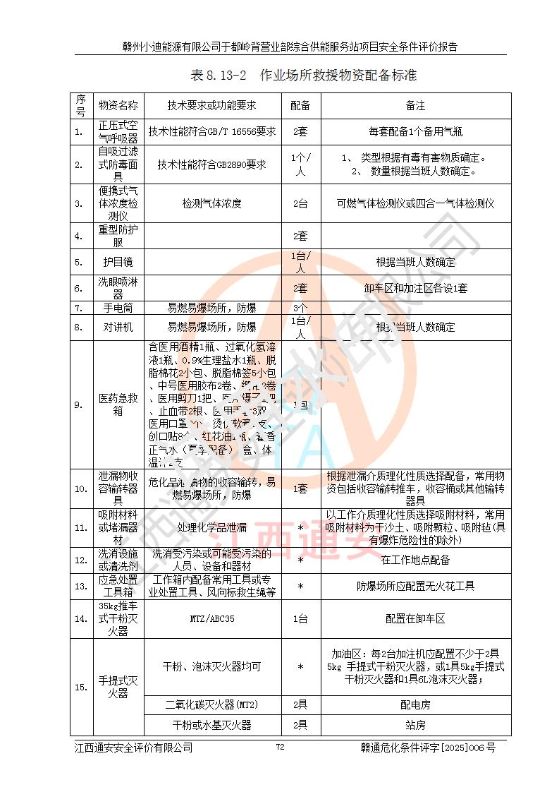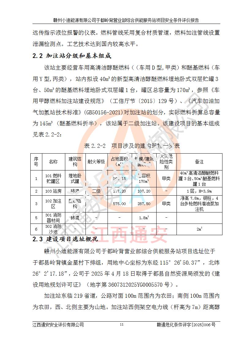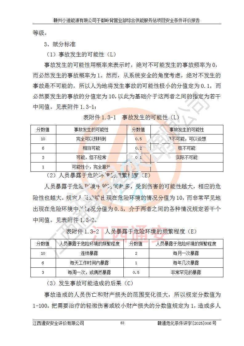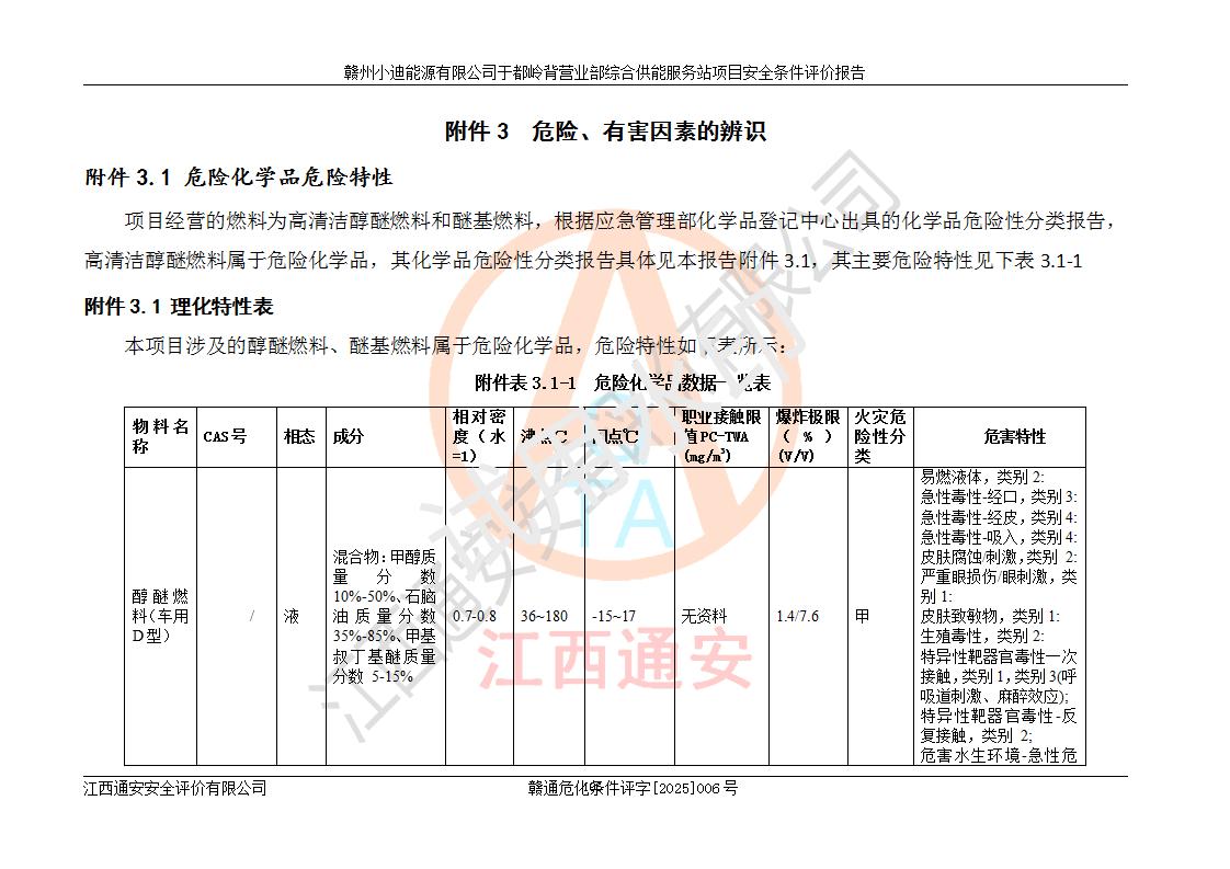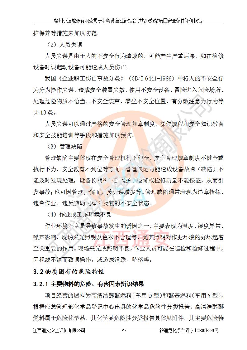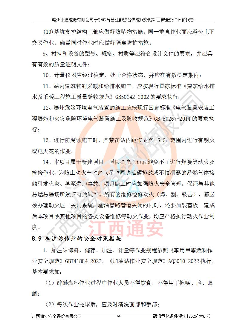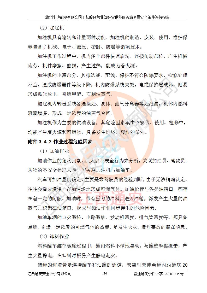 一、安全狀況綜合評(píng)述 通過(guò)對(duì)本項(xiàng)目的危險(xiǎn)、有害因素分析及定性、定量評(píng)價(jià),結(jié)果為: 1)本項(xiàng)目存在的危險(xiǎn)有害因素是火災(zāi)爆炸、**傷害、高處墜落、物體打擊、觸電、機(jī)械傷害、中毒窒息、坍塌等,主要危險(xiǎn)有害因素為火災(zāi)、爆炸等危險(xiǎn)因素。需重點(diǎn)防范的危險(xiǎn)有害因素為火災(zāi)、爆炸。本項(xiàng)目未構(gòu)成危險(xiǎn)化學(xué)品重大危險(xiǎn)源,也不存在劇毒、監(jiān)控、易制毒、易制爆化學(xué)品及高毒物品,高清潔醇醚燃料主要成分甲醇和石腦油為重點(diǎn)監(jiān)管危險(xiǎn)化學(xué)品,應(yīng)按照重點(diǎn)監(jiān)管危險(xiǎn)化學(xué)品相關(guān)規(guī)定管理。 2)預(yù)先危險(xiǎn)性分析表明該加注站儲(chǔ)存、經(jīng)營(yíng)過(guò)程中火災(zāi)、爆炸、觸電的危險(xiǎn)等級(jí)為Ⅲ級(jí),**傷害、高處墜落和中毒窒息等危險(xiǎn)等級(jí)為Ⅱ級(jí)。 3)從作業(yè)條件危險(xiǎn)性分析結(jié)果可以看出,在選定的評(píng)價(jià)單元中卸液作業(yè)、加注作業(yè)、變配電作業(yè)和維修作業(yè)中卸液作業(yè)中火災(zāi)爆炸、**傷害、觸電、中毒、窒息潛在危險(xiǎn)均為一般危險(xiǎn)。 4)從危險(xiǎn)度分析結(jié)果可以看出,燃料罐區(qū)屬中度危險(xiǎn)。 5)根據(jù)選址與總平面布置安全檢查表,該加注站符合《建筑設(shè)計(jì)防火規(guī)范》GB 50016-2014(2018年版)、《汽車(chē)加油加氣加氫站技術(shù)標(biāo)準(zhǔn)》GB50156-2021及《車(chē)用甲醇燃料加注站建設(shè)規(guī)范》(工信廳節(jié)〔2015〕129號(hào))等有關(guān)標(biāo)準(zhǔn)、規(guī)范的規(guī)定。該站與站外建筑物距離符合規(guī)范要求,站外50m內(nèi)無(wú)重要建筑物和明火設(shè)施。 6)根據(jù)立項(xiàng)批文及于都縣自然資源局出具的建設(shè)用地規(guī)劃許可證,該加注站符合有關(guān)部門(mén)的審批。 7)本項(xiàng)目采用成熟的工藝設(shè)備,項(xiàng)目在嚴(yán)格按照**相關(guān)法律、法規(guī)及技術(shù)標(biāo)準(zhǔn)制造、安裝、檢測(cè)檢驗(yàn)的情況下,其安全生產(chǎn)風(fēng)險(xiǎn)程度在可接受范圍。 8)本項(xiàng)目危害物質(zhì)為高清潔醇醚燃料(車(chē)用D型,甲類(lèi))和醚基燃料(車(chē)用Y型,丙類(lèi)),應(yīng)重點(diǎn)注意火災(zāi)、爆炸危害,做好防火防靜電措施。**加注站罐區(qū)、加注區(qū)無(wú)明火產(chǎn)生;卸液口應(yīng)設(shè)置防靜電報(bào)警器,罐區(qū)法蘭應(yīng)跨接,防止靜電引起火災(zāi)爆炸事故。 四、評(píng)價(jià)結(jié)論 贛州小迪能源有限公司于都嶺背營(yíng)業(yè)部綜合供能服務(wù)站項(xiàng)目總平面布置符合相關(guān)規(guī)范的要求。在項(xiàng)目建設(shè)和運(yùn)行階段,總平面布置設(shè)計(jì)、施工圖設(shè)計(jì)和建設(shè)施工、安裝調(diào)試及生產(chǎn)運(yùn)行中,應(yīng)嚴(yán)格執(zhí)行**有關(guān)安全生產(chǎn)法律、法規(guī)和有關(guān)標(biāo)準(zhǔn)、規(guī)范,將本報(bào)告中提出的安全對(duì)策措施落實(shí)到位,真正做到安全設(shè)施與主體工程同時(shí)設(shè)計(jì)、同時(shí)施工、同時(shí)投入生產(chǎn)和使用,項(xiàng)目建成后危險(xiǎn)、有害因素可以得到**控制,安全風(fēng)險(xiǎn)在可接受范圍,擬建的贛州小迪能源有限公司于都嶺背營(yíng)業(yè)部綜合供能服務(wù)站項(xiàng)目符合法律法規(guī)、標(biāo)準(zhǔn)、規(guī)章和規(guī)范的要求。 |