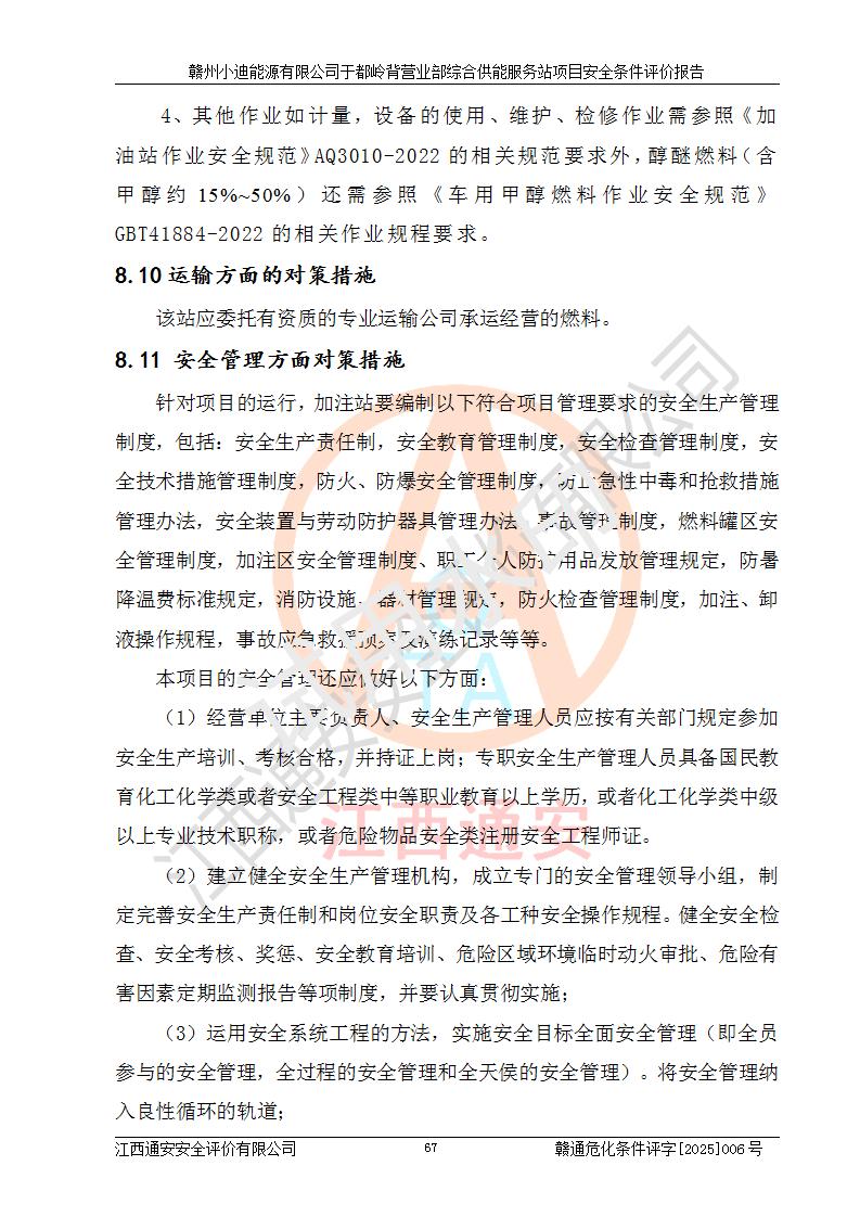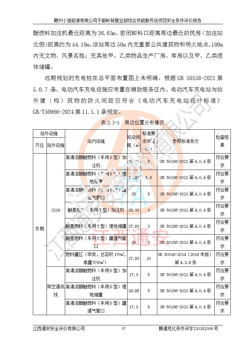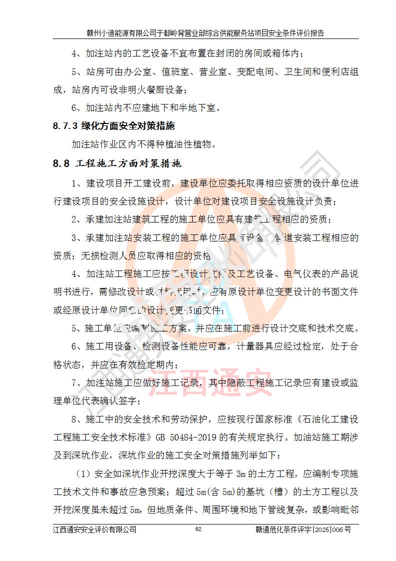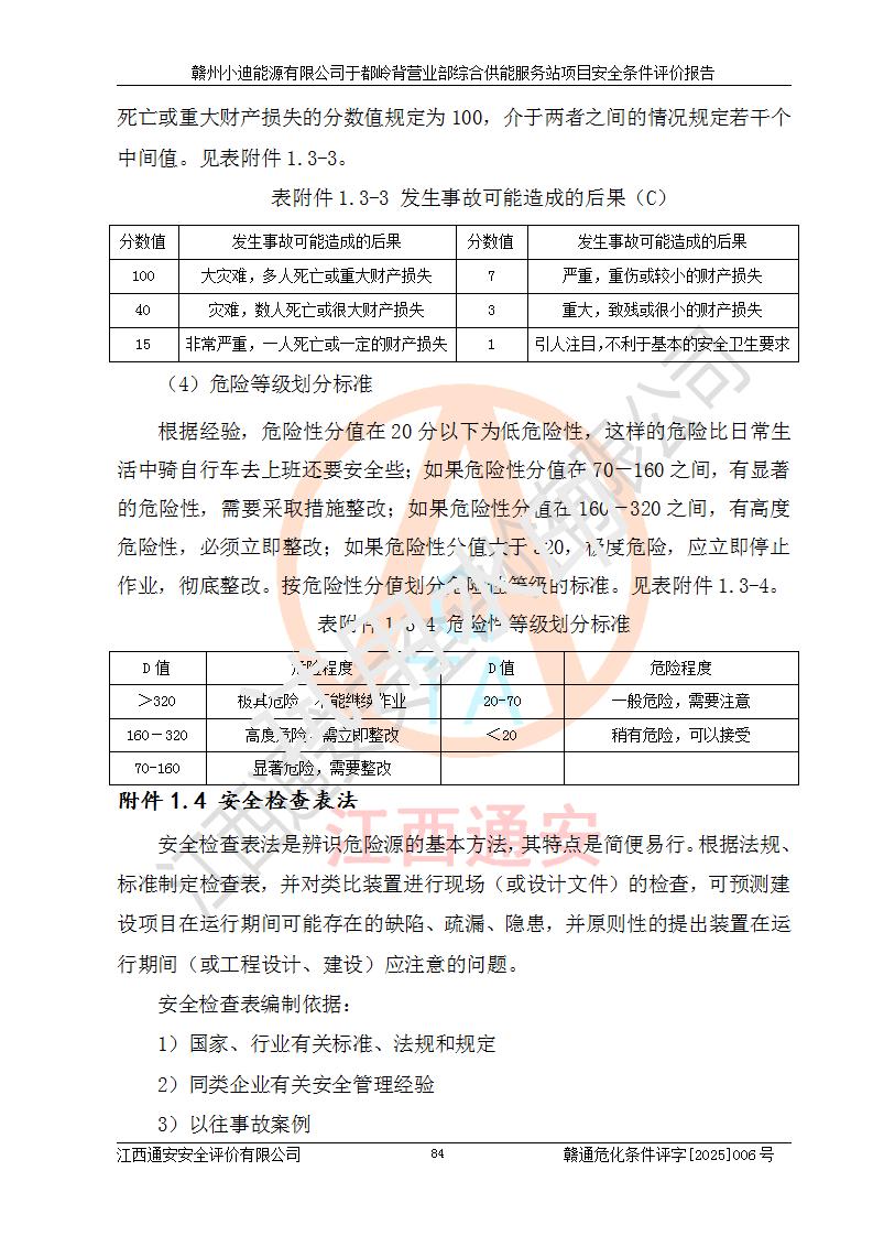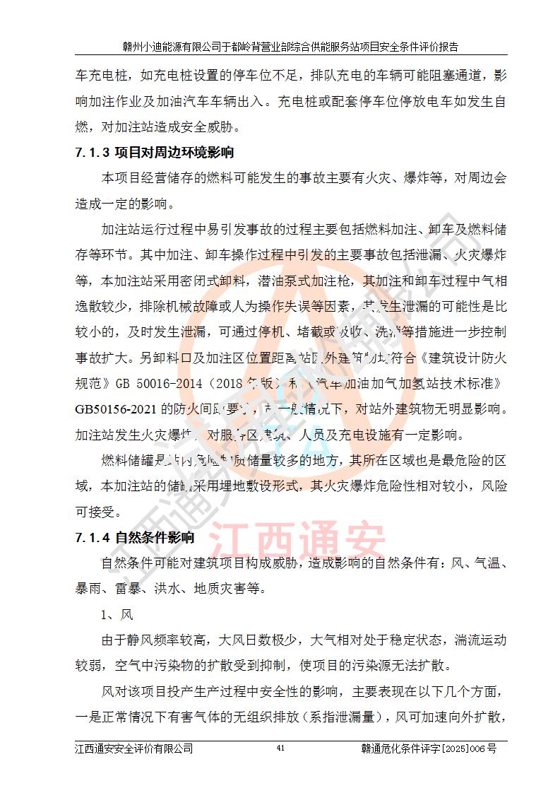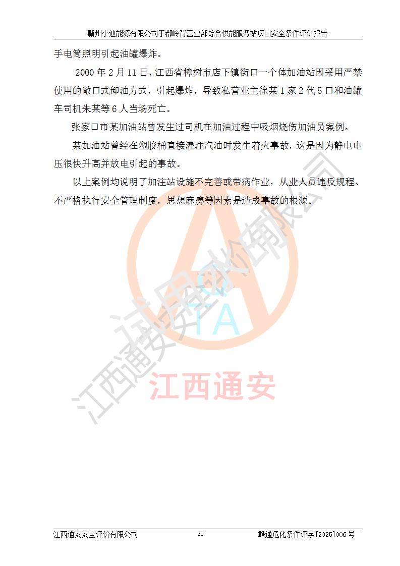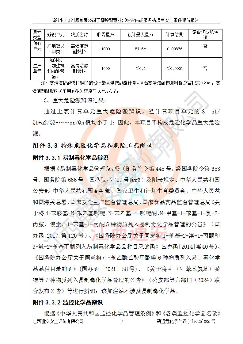 一、安全狀況綜合評(píng)述 通過(guò)對(duì)本項(xiàng)目的危險(xiǎn)、有害因素分析及定性、定量評(píng)價(jià),結(jié)果為: 1)本項(xiàng)目存在的危險(xiǎn)有害因素是火災(zāi)爆炸、**傷害、高處墜落、物體打擊、觸電、機(jī)械傷害、中毒窒息、坍塌等,主要危險(xiǎn)有害因素為火災(zāi)、爆炸等危險(xiǎn)因素。需重點(diǎn)防范的危險(xiǎn)有害因素為火災(zāi)、爆炸。本項(xiàng)目未構(gòu)成危險(xiǎn)化學(xué)品重大危險(xiǎn)源,也不存在劇毒、監(jiān)控、易制毒、易制爆化學(xué)品及高毒物品,高清潔醇醚燃料主要成分甲醇和石腦油為重點(diǎn)監(jiān)管危險(xiǎn)化學(xué)品,應(yīng)按照重點(diǎn)監(jiān)管危險(xiǎn)化學(xué)品相關(guān)規(guī)定管理。 2)預(yù)先危險(xiǎn)性分析表明該加注站儲(chǔ)存、經(jīng)營(yíng)過(guò)程中火災(zāi)、爆炸、觸電的危險(xiǎn)等級(jí)為Ⅲ級(jí),**傷害、高處墜落和中毒窒息等危險(xiǎn)等級(jí)為Ⅱ級(jí)。 3)從作業(yè)條件危險(xiǎn)性分析結(jié)果可以看出,在選定的評(píng)價(jià)單元中卸液作業(yè)、加注作業(yè)、變配電作業(yè)和維修作業(yè)中卸液作業(yè)中火災(zāi)爆炸、**傷害、觸電、中毒、窒息潛在危險(xiǎn)均為一般危險(xiǎn)。 4)從危險(xiǎn)度分析結(jié)果可以看出,燃料罐區(qū)屬中度危險(xiǎn)。 5)根據(jù)選址與總平面布置安全檢查表,該加注站符合《建筑設(shè)計(jì)防火規(guī)范》GB 50016-2014(2018年版)、《汽車(chē)加油加氣加氫站技術(shù)標(biāo)準(zhǔn)》GB50156-2021及《車(chē)用甲醇燃料加注站建設(shè)規(guī)范》(工信廳節(jié)〔2015〕129號(hào))等有關(guān)標(biāo)準(zhǔn)、規(guī)范的規(guī)定。該站與站外建筑物距離符合規(guī)范要求,站外50m內(nèi)無(wú)重要建筑物和明火設(shè)施。 6)根據(jù)立項(xiàng)批文及于都縣自然資源局出具的建設(shè)用地規(guī)劃許可證,該加注站符合有關(guān)部門(mén)的審批。 7)本項(xiàng)目采用成熟的工藝設(shè)備,項(xiàng)目在嚴(yán)格按照**相關(guān)法律、法規(guī)及技術(shù)標(biāo)準(zhǔn)制造、安裝、檢測(cè)檢驗(yàn)的情況下,其安全生產(chǎn)風(fēng)險(xiǎn)程度在可接受范圍。 8)本項(xiàng)目危害物質(zhì)為高清潔醇醚燃料(車(chē)用D型,甲類(lèi))和醚基燃料(車(chē)用Y型,丙類(lèi)),應(yīng)重點(diǎn)注意火災(zāi)、爆炸危害,做好防火防靜電措施。**加注站罐區(qū)、加注區(qū)無(wú)明火產(chǎn)生;卸液口應(yīng)設(shè)置防靜電報(bào)警器,罐區(qū)法蘭應(yīng)跨接,防止靜電引起火災(zāi)爆炸事故。 四、評(píng)價(jià)結(jié)論 贛州小迪能源有限公司于都嶺背營(yíng)業(yè)部綜合供能服務(wù)站項(xiàng)目總平面布置符合相關(guān)規(guī)范的要求。在項(xiàng)目建設(shè)和運(yùn)行階段,總平面布置設(shè)計(jì)、施工圖設(shè)計(jì)和建設(shè)施工、安裝調(diào)試及生產(chǎn)運(yùn)行中,應(yīng)嚴(yán)格執(zhí)行**有關(guān)安全生產(chǎn)法律、法規(guī)和有關(guān)標(biāo)準(zhǔn)、規(guī)范,將本報(bào)告中提出的安全對(duì)策措施落實(shí)到位,真正做到安全設(shè)施與主體工程同時(shí)設(shè)計(jì)、同時(shí)施工、同時(shí)投入生產(chǎn)和使用,項(xiàng)目建成后危險(xiǎn)、有害因素可以得到**控制,安全風(fēng)險(xiǎn)在可接受范圍,擬建的贛州小迪能源有限公司于都嶺背營(yíng)業(yè)部綜合供能服務(wù)站項(xiàng)目符合法律法規(guī)、標(biāo)準(zhǔn)、規(guī)章和規(guī)范的要求。 |