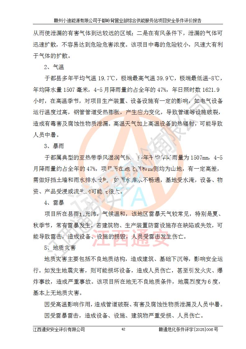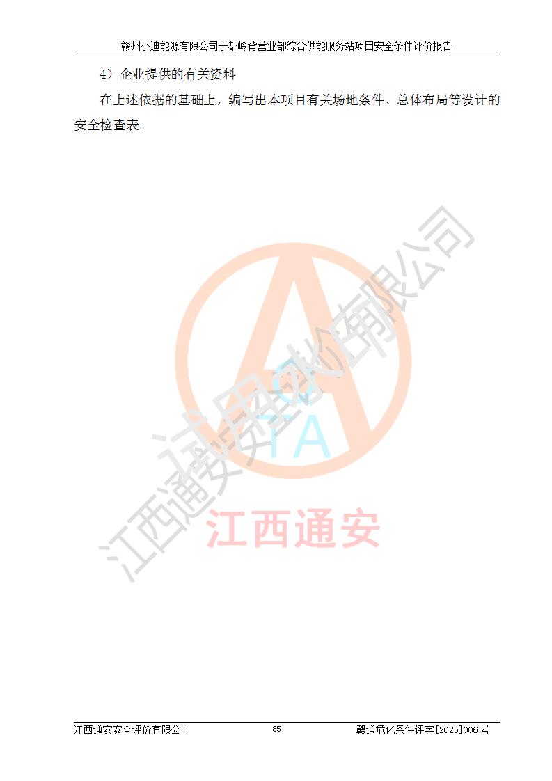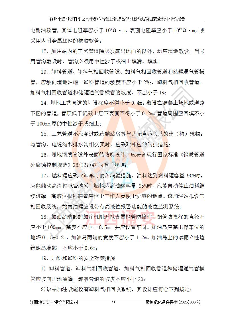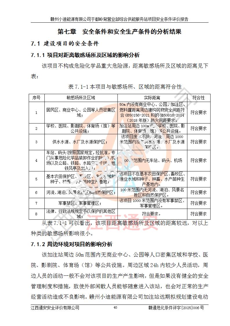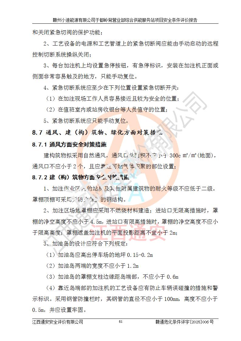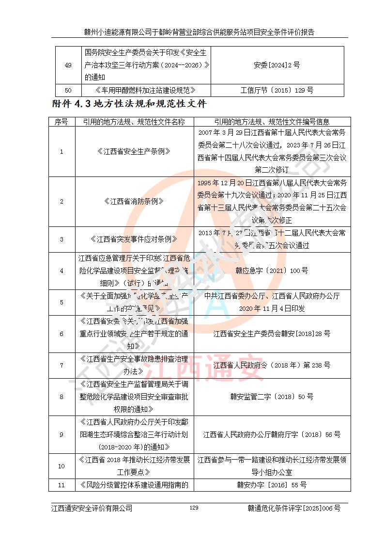一、安全狀況綜合評(píng)述 通過(guò)對(duì)本項(xiàng)目的危險(xiǎn)、有害因素分析及定性、定量評(píng)價(jià),結(jié)果為: 1)本項(xiàng)目存在的危險(xiǎn)有害因素是火災(zāi)爆炸、**傷害、高處墜落、物體打擊、觸電、機(jī)械傷害、中毒窒息、坍塌等,主要危險(xiǎn)有害因素為火災(zāi)、爆炸等危險(xiǎn)因素。需重點(diǎn)防范的危險(xiǎn)有害因素為火災(zāi)、爆炸。本項(xiàng)目未構(gòu)成危險(xiǎn)化學(xué)品重大危險(xiǎn)源,也不存在劇毒、監(jiān)控、易制毒、易制爆化學(xué)品及高毒物品,高清潔醇醚燃料主要成分甲醇和石腦油為重點(diǎn)監(jiān)管危險(xiǎn)化學(xué)品,應(yīng)按照重點(diǎn)監(jiān)管危險(xiǎn)化學(xué)品相關(guān)規(guī)定管理。 2)預(yù)先危險(xiǎn)性分析表明該加注站儲(chǔ)存、經(jīng)營(yíng)過(guò)程中火災(zāi)、爆炸、觸電的危險(xiǎn)等級(jí)為Ⅲ級(jí),**傷害、高處墜落和中毒窒息等危險(xiǎn)等級(jí)為Ⅱ級(jí)。 3)從作業(yè)條件危險(xiǎn)性分析結(jié)果可以看出,在選定的評(píng)價(jià)單元中卸液作業(yè)、加注作業(yè)、變配電作業(yè)和維修作業(yè)中卸液作業(yè)中火災(zāi)爆炸、**傷害、觸電、中毒、窒息潛在危險(xiǎn)均為一般危險(xiǎn)。 4)從危險(xiǎn)度分析結(jié)果可以看出,燃料罐區(qū)屬中度危險(xiǎn)。 5)根據(jù)選址與總平面布置安全檢查表,該加注站符合《建筑設(shè)計(jì)防火規(guī)范》GB 50016-2014(2018年版)、《汽車(chē)加油加氣加氫站技術(shù)標(biāo)準(zhǔn)》GB50156-2021及《車(chē)用甲醇燃料加注站建設(shè)規(guī)范》(工信廳節(jié)〔2015〕129號(hào))等有關(guān)標(biāo)準(zhǔn)、規(guī)范的規(guī)定。該站與站外建筑物距離符合規(guī)范要求,站外50m內(nèi)無(wú)重要建筑物和明火設(shè)施。 6)根據(jù)立項(xiàng)批文及于都縣自然資源局出具的建設(shè)用地規(guī)劃許可證,該加注站符合有關(guān)部門(mén)的審批。 7)本項(xiàng)目采用成熟的工藝設(shè)備,項(xiàng)目在嚴(yán)格按照**相關(guān)法律、法規(guī)及技術(shù)標(biāo)準(zhǔn)制造、安裝、檢測(cè)檢驗(yàn)的情況下,其安全生產(chǎn)風(fēng)險(xiǎn)程度在可接受范圍。 8)本項(xiàng)目危害物質(zhì)為高清潔醇醚燃料(車(chē)用D型,甲類(lèi))和醚基燃料(車(chē)用Y型,丙類(lèi)),應(yīng)重點(diǎn)注意火災(zāi)、爆炸危害,做好防火防靜電措施。**加注站罐區(qū)、加注區(qū)無(wú)明火產(chǎn)生;卸液口應(yīng)設(shè)置防靜電報(bào)警器,罐區(qū)法蘭應(yīng)跨接,防止靜電引起火災(zāi)爆炸事故。 四、評(píng)價(jià)結(jié)論 贛州小迪能源有限公司于都嶺背營(yíng)業(yè)部綜合供能服務(wù)站項(xiàng)目總平面布置符合相關(guān)規(guī)范的要求。在項(xiàng)目建設(shè)和運(yùn)行階段,總平面布置設(shè)計(jì)、施工圖設(shè)計(jì)和建設(shè)施工、安裝調(diào)試及生產(chǎn)運(yùn)行中,應(yīng)嚴(yán)格執(zhí)行**有關(guān)安全生產(chǎn)法律、法規(guī)和有關(guān)標(biāo)準(zhǔn)、規(guī)范,將本報(bào)告中提出的安全對(duì)策措施落實(shí)到位,真正做到安全設(shè)施與主體工程同時(shí)設(shè)計(jì)、同時(shí)施工、同時(shí)投入生產(chǎn)和使用,項(xiàng)目建成后危險(xiǎn)、有害因素可以得到**控制,安全風(fēng)險(xiǎn)在可接受范圍,擬建的贛州小迪能源有限公司于都嶺背營(yíng)業(yè)部綜合供能服務(wù)站項(xiàng)目符合法律法規(guī)、標(biāo)準(zhǔn)、規(guī)章和規(guī)范的要求。 |