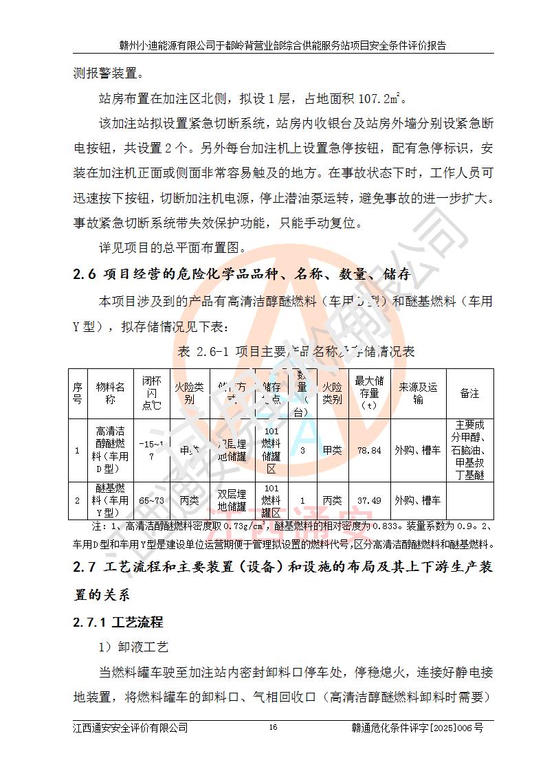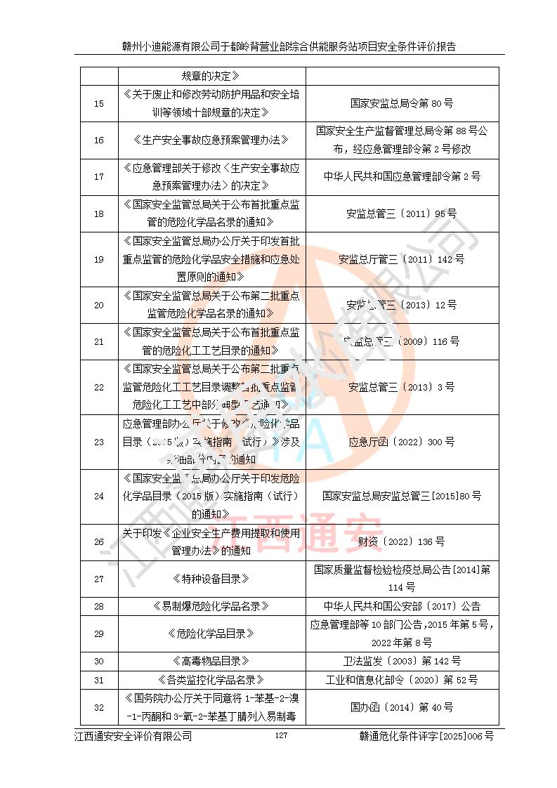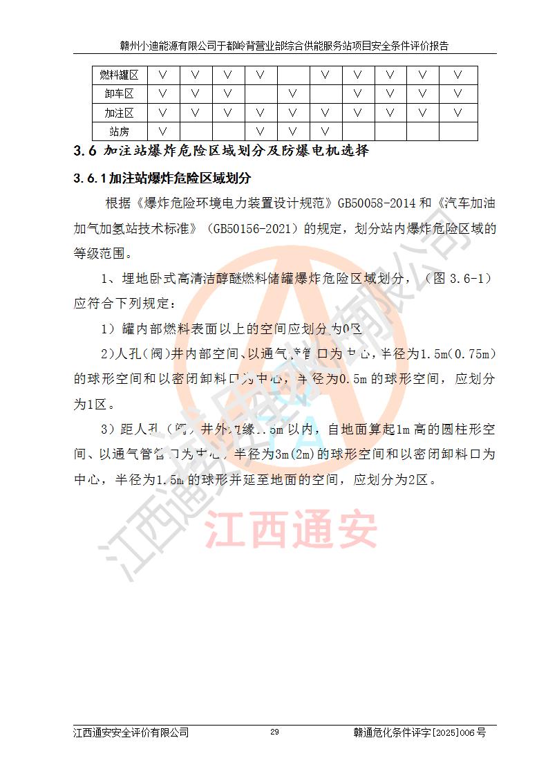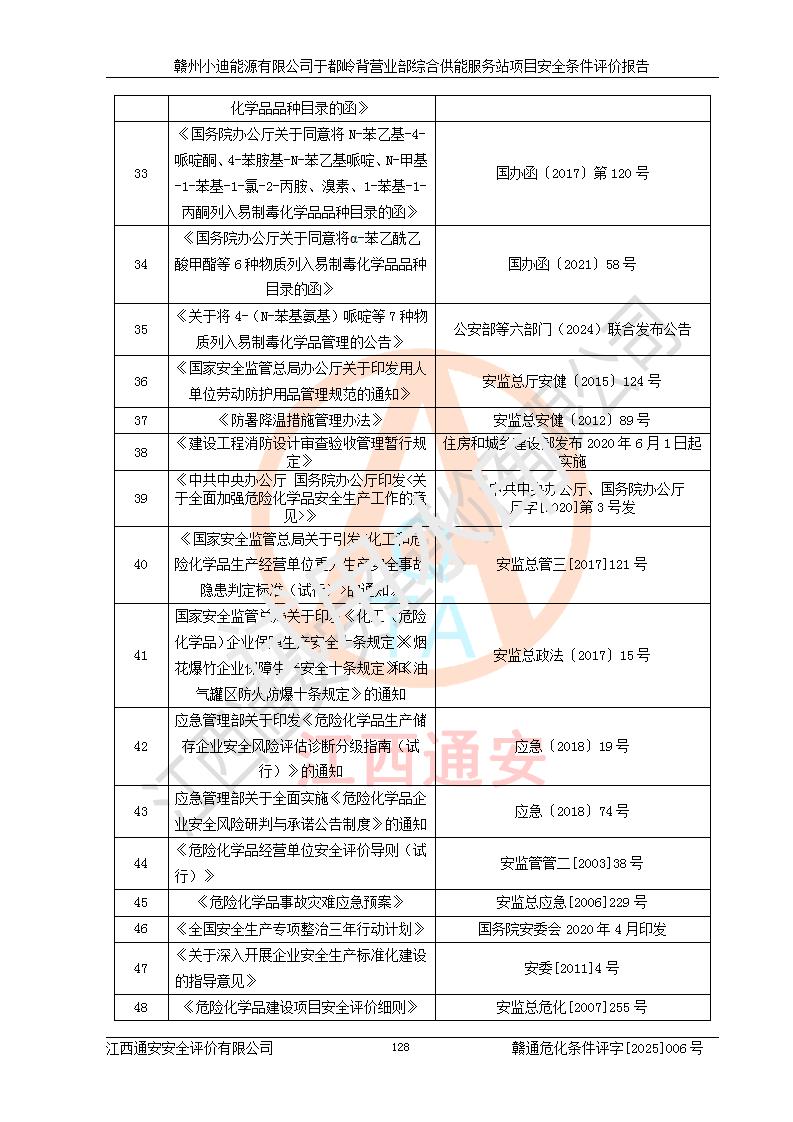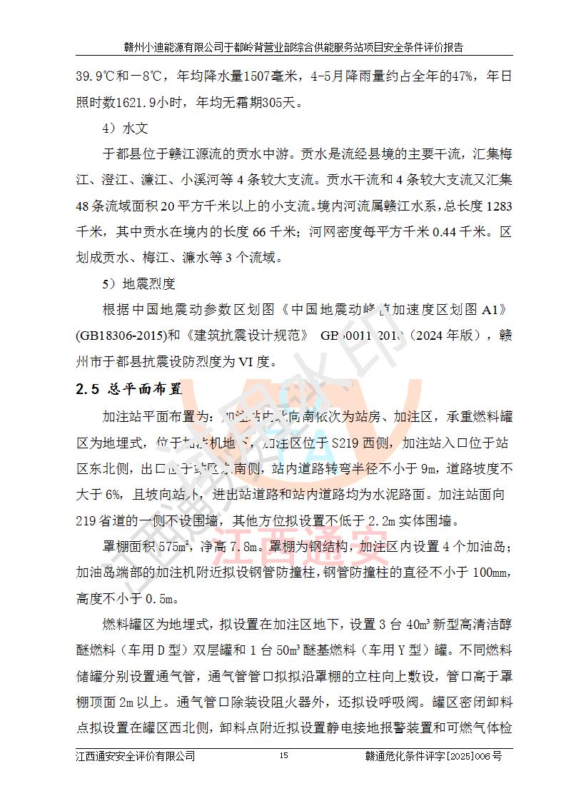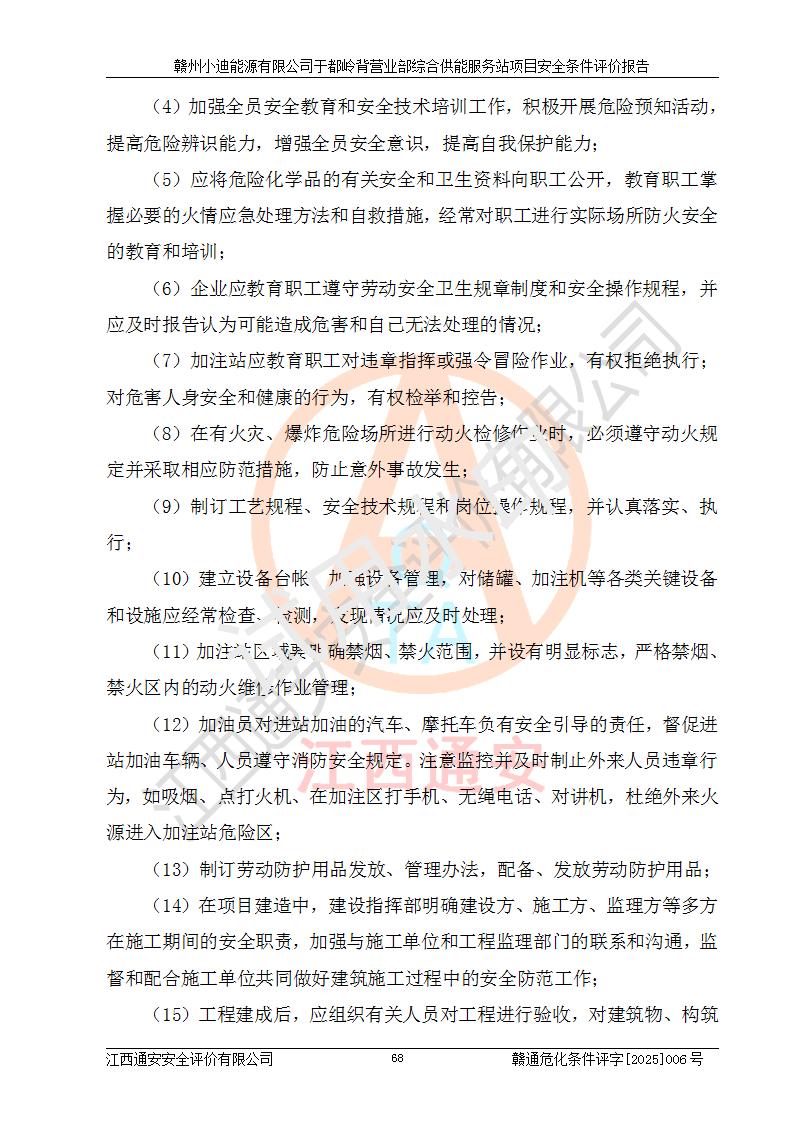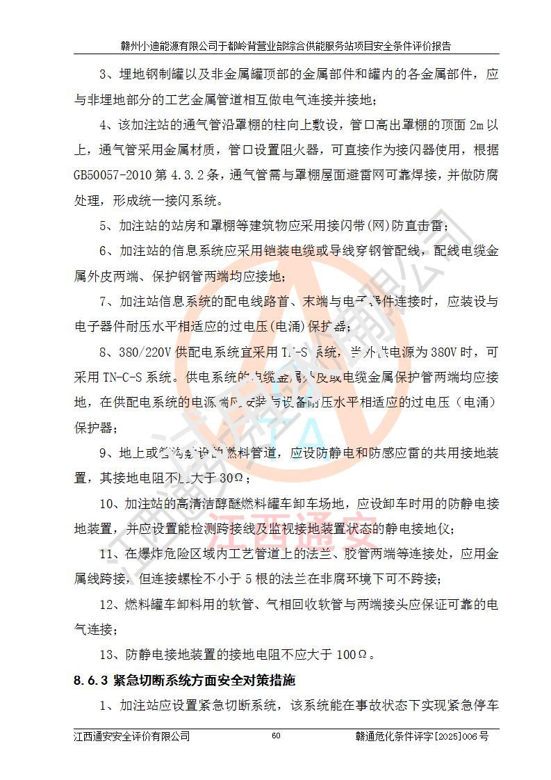 一、安全狀況綜合評(píng)述 通過(guò)對(duì)本項(xiàng)目的危險(xiǎn)、有害因素分析及定性、定量評(píng)價(jià),結(jié)果為: 1)本項(xiàng)目存在的危險(xiǎn)有害因素是火災(zāi)爆炸、**傷害、高處墜落、物體打擊、觸電、機(jī)械傷害、中毒窒息、坍塌等,主要危險(xiǎn)有害因素為火災(zāi)、爆炸等危險(xiǎn)因素。需重點(diǎn)防范的危險(xiǎn)有害因素為火災(zāi)、爆炸。本項(xiàng)目未構(gòu)成危險(xiǎn)化學(xué)品重大危險(xiǎn)源,也不存在劇毒、監(jiān)控、易制毒、易制爆化學(xué)品及高毒物品,高清潔醇醚燃料主要成分甲醇和石腦油為重點(diǎn)監(jiān)管危險(xiǎn)化學(xué)品,應(yīng)按照重點(diǎn)監(jiān)管危險(xiǎn)化學(xué)品相關(guān)規(guī)定管理。 2)預(yù)先危險(xiǎn)性分析表明該加注站儲(chǔ)存、經(jīng)營(yíng)過(guò)程中火災(zāi)、爆炸、觸電的危險(xiǎn)等級(jí)為Ⅲ級(jí),**傷害、高處墜落和中毒窒息等危險(xiǎn)等級(jí)為Ⅱ級(jí)。 3)從作業(yè)條件危險(xiǎn)性分析結(jié)果可以看出,在選定的評(píng)價(jià)單元中卸液作業(yè)、加注作業(yè)、變配電作業(yè)和維修作業(yè)中卸液作業(yè)中火災(zāi)爆炸、**傷害、觸電、中毒、窒息潛在危險(xiǎn)均為一般危險(xiǎn)。 4)從危險(xiǎn)度分析結(jié)果可以看出,燃料罐區(qū)屬中度危險(xiǎn)。 5)根據(jù)選址與總平面布置安全檢查表,該加注站符合《建筑設(shè)計(jì)防火規(guī)范》GB 50016-2014(2018年版)、《汽車(chē)加油加氣加氫站技術(shù)標(biāo)準(zhǔn)》GB50156-2021及《車(chē)用甲醇燃料加注站建設(shè)規(guī)范》(工信廳節(jié)〔2015〕129號(hào))等有關(guān)標(biāo)準(zhǔn)、規(guī)范的規(guī)定。該站與站外建筑物距離符合規(guī)范要求,站外50m內(nèi)無(wú)重要建筑物和明火設(shè)施。 6)根據(jù)立項(xiàng)批文及于都縣自然資源局出具的建設(shè)用地規(guī)劃許可證,該加注站符合有關(guān)部門(mén)的審批。 7)本項(xiàng)目采用成熟的工藝設(shè)備,項(xiàng)目在嚴(yán)格按照**相關(guān)法律、法規(guī)及技術(shù)標(biāo)準(zhǔn)制造、安裝、檢測(cè)檢驗(yàn)的情況下,其安全生產(chǎn)風(fēng)險(xiǎn)程度在可接受范圍。 8)本項(xiàng)目危害物質(zhì)為高清潔醇醚燃料(車(chē)用D型,甲類(lèi))和醚基燃料(車(chē)用Y型,丙類(lèi)),應(yīng)重點(diǎn)注意火災(zāi)、爆炸危害,做好防火防靜電措施。**加注站罐區(qū)、加注區(qū)無(wú)明火產(chǎn)生;卸液口應(yīng)設(shè)置防靜電報(bào)警器,罐區(qū)法蘭應(yīng)跨接,防止靜電引起火災(zāi)爆炸事故。 四、評(píng)價(jià)結(jié)論 贛州小迪能源有限公司于都嶺背營(yíng)業(yè)部綜合供能服務(wù)站項(xiàng)目總平面布置符合相關(guān)規(guī)范的要求。在項(xiàng)目建設(shè)和運(yùn)行階段,總平面布置設(shè)計(jì)、施工圖設(shè)計(jì)和建設(shè)施工、安裝調(diào)試及生產(chǎn)運(yùn)行中,應(yīng)嚴(yán)格執(zhí)行**有關(guān)安全生產(chǎn)法律、法規(guī)和有關(guān)標(biāo)準(zhǔn)、規(guī)范,將本報(bào)告中提出的安全對(duì)策措施落實(shí)到位,真正做到安全設(shè)施與主體工程同時(shí)設(shè)計(jì)、同時(shí)施工、同時(shí)投入生產(chǎn)和使用,項(xiàng)目建成后危險(xiǎn)、有害因素可以得到**控制,安全風(fēng)險(xiǎn)在可接受范圍,擬建的贛州小迪能源有限公司于都嶺背營(yíng)業(yè)部綜合供能服務(wù)站項(xiàng)目符合法律法規(guī)、標(biāo)準(zhǔn)、規(guī)章和規(guī)范的要求。 |