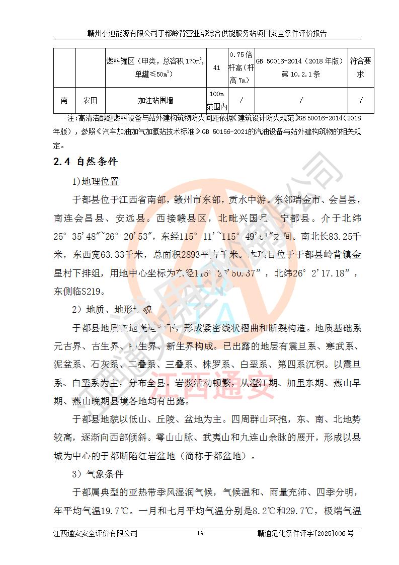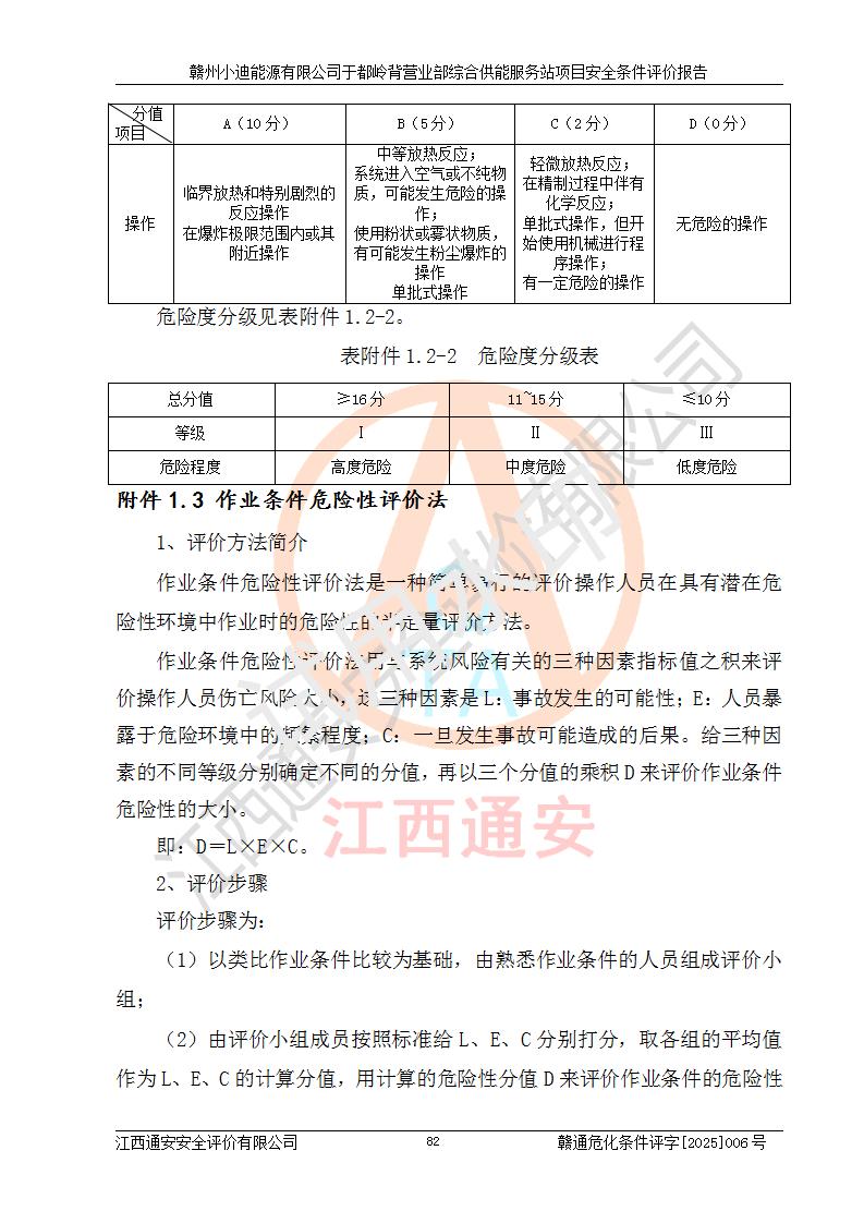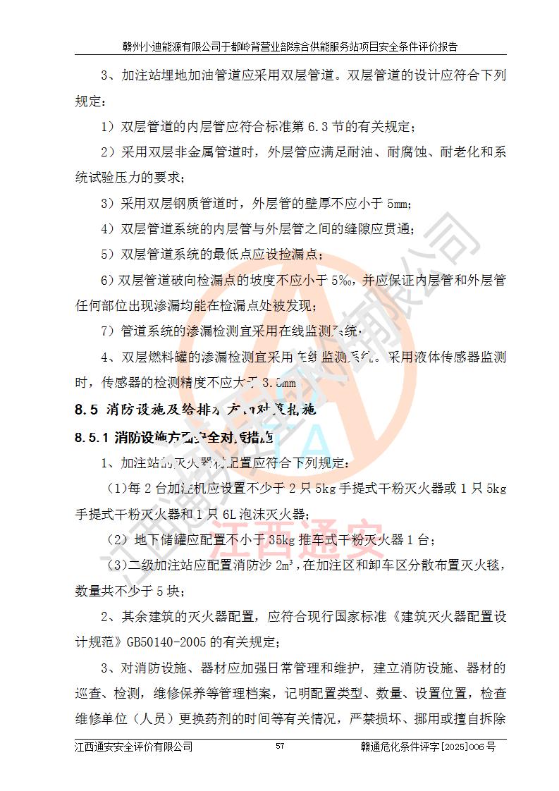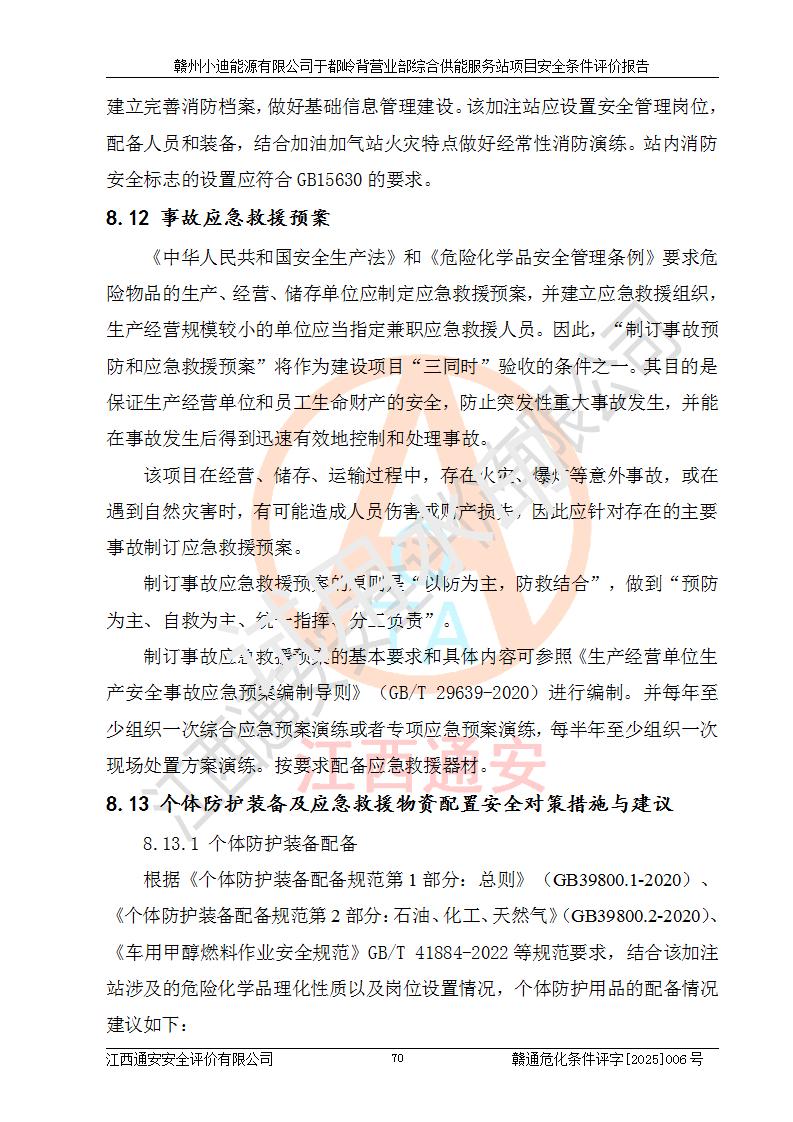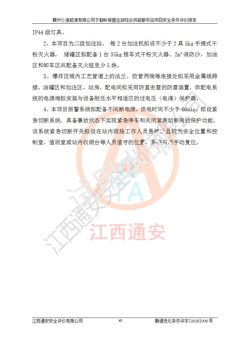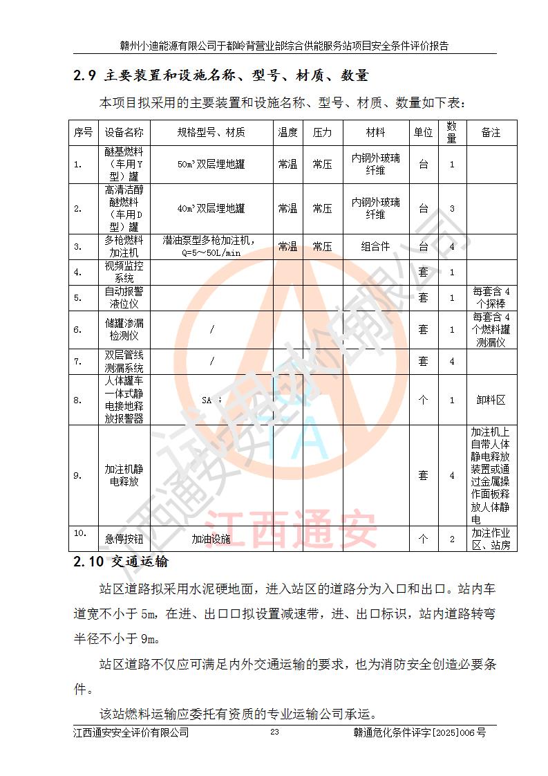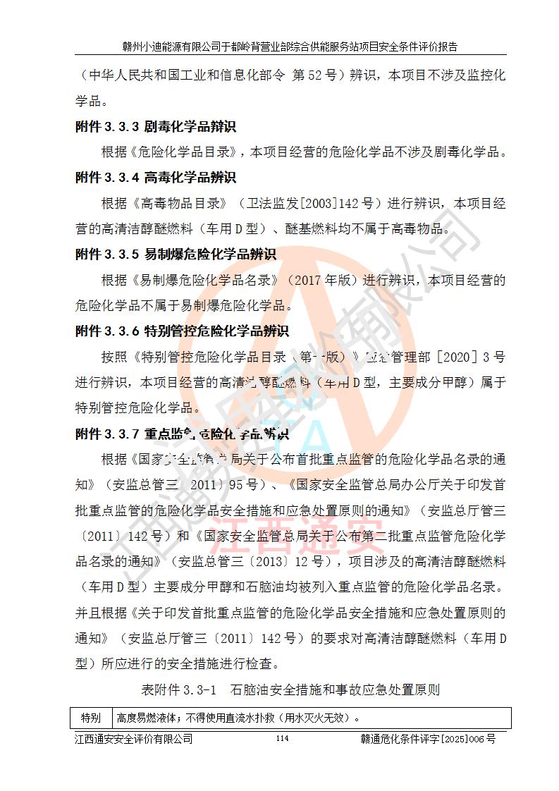 一、安全狀況綜合評(píng)述 通過(guò)對(duì)本項(xiàng)目的危險(xiǎn)、有害因素分析及定性、定量評(píng)價(jià),結(jié)果為: 1)本項(xiàng)目存在的危險(xiǎn)有害因素是火災(zāi)爆炸、**傷害、高處墜落、物體打擊、觸電、機(jī)械傷害、中毒窒息、坍塌等,主要危險(xiǎn)有害因素為火災(zāi)、爆炸等危險(xiǎn)因素。需重點(diǎn)防范的危險(xiǎn)有害因素為火災(zāi)、爆炸。本項(xiàng)目未構(gòu)成危險(xiǎn)化學(xué)品重大危險(xiǎn)源,也不存在劇毒、監(jiān)控、易制毒、易制爆化學(xué)品及高毒物品,高清潔醇醚燃料主要成分甲醇和石腦油為重點(diǎn)監(jiān)管危險(xiǎn)化學(xué)品,應(yīng)按照重點(diǎn)監(jiān)管危險(xiǎn)化學(xué)品相關(guān)規(guī)定管理。 2)預(yù)先危險(xiǎn)性分析表明該加注站儲(chǔ)存、經(jīng)營(yíng)過(guò)程中火災(zāi)、爆炸、觸電的危險(xiǎn)等級(jí)為Ⅲ級(jí),**傷害、高處墜落和中毒窒息等危險(xiǎn)等級(jí)為Ⅱ級(jí)。 3)從作業(yè)條件危險(xiǎn)性分析結(jié)果可以看出,在選定的評(píng)價(jià)單元中卸液作業(yè)、加注作業(yè)、變配電作業(yè)和維修作業(yè)中卸液作業(yè)中火災(zāi)爆炸、**傷害、觸電、中毒、窒息潛在危險(xiǎn)均為一般危險(xiǎn)。 4)從危險(xiǎn)度分析結(jié)果可以看出,燃料罐區(qū)屬中度危險(xiǎn)。 5)根據(jù)選址與總平面布置安全檢查表,該加注站符合《建筑設(shè)計(jì)防火規(guī)范》GB 50016-2014(2018年版)、《汽車(chē)加油加氣加氫站技術(shù)標(biāo)準(zhǔn)》GB50156-2021及《車(chē)用甲醇燃料加注站建設(shè)規(guī)范》(工信廳節(jié)〔2015〕129號(hào))等有關(guān)標(biāo)準(zhǔn)、規(guī)范的規(guī)定。該站與站外建筑物距離符合規(guī)范要求,站外50m內(nèi)無(wú)重要建筑物和明火設(shè)施。 6)根據(jù)立項(xiàng)批文及于都縣自然資源局出具的建設(shè)用地規(guī)劃許可證,該加注站符合有關(guān)部門(mén)的審批。 7)本項(xiàng)目采用成熟的工藝設(shè)備,項(xiàng)目在嚴(yán)格按照**相關(guān)法律、法規(guī)及技術(shù)標(biāo)準(zhǔn)制造、安裝、檢測(cè)檢驗(yàn)的情況下,其安全生產(chǎn)風(fēng)險(xiǎn)程度在可接受范圍。 8)本項(xiàng)目危害物質(zhì)為高清潔醇醚燃料(車(chē)用D型,甲類(lèi))和醚基燃料(車(chē)用Y型,丙類(lèi)),應(yīng)重點(diǎn)注意火災(zāi)、爆炸危害,做好防火防靜電措施。**加注站罐區(qū)、加注區(qū)無(wú)明火產(chǎn)生;卸液口應(yīng)設(shè)置防靜電報(bào)警器,罐區(qū)法蘭應(yīng)跨接,防止靜電引起火災(zāi)爆炸事故。 四、評(píng)價(jià)結(jié)論 贛州小迪能源有限公司于都嶺背營(yíng)業(yè)部綜合供能服務(wù)站項(xiàng)目總平面布置符合相關(guān)規(guī)范的要求。在項(xiàng)目建設(shè)和運(yùn)行階段,總平面布置設(shè)計(jì)、施工圖設(shè)計(jì)和建設(shè)施工、安裝調(diào)試及生產(chǎn)運(yùn)行中,應(yīng)嚴(yán)格執(zhí)行**有關(guān)安全生產(chǎn)法律、法規(guī)和有關(guān)標(biāo)準(zhǔn)、規(guī)范,將本報(bào)告中提出的安全對(duì)策措施落實(shí)到位,真正做到安全設(shè)施與主體工程同時(shí)設(shè)計(jì)、同時(shí)施工、同時(shí)投入生產(chǎn)和使用,項(xiàng)目建成后危險(xiǎn)、有害因素可以得到**控制,安全風(fēng)險(xiǎn)在可接受范圍,擬建的贛州小迪能源有限公司于都嶺背營(yíng)業(yè)部綜合供能服務(wù)站項(xiàng)目符合法律法規(guī)、標(biāo)準(zhǔn)、規(guī)章和規(guī)范的要求。 |