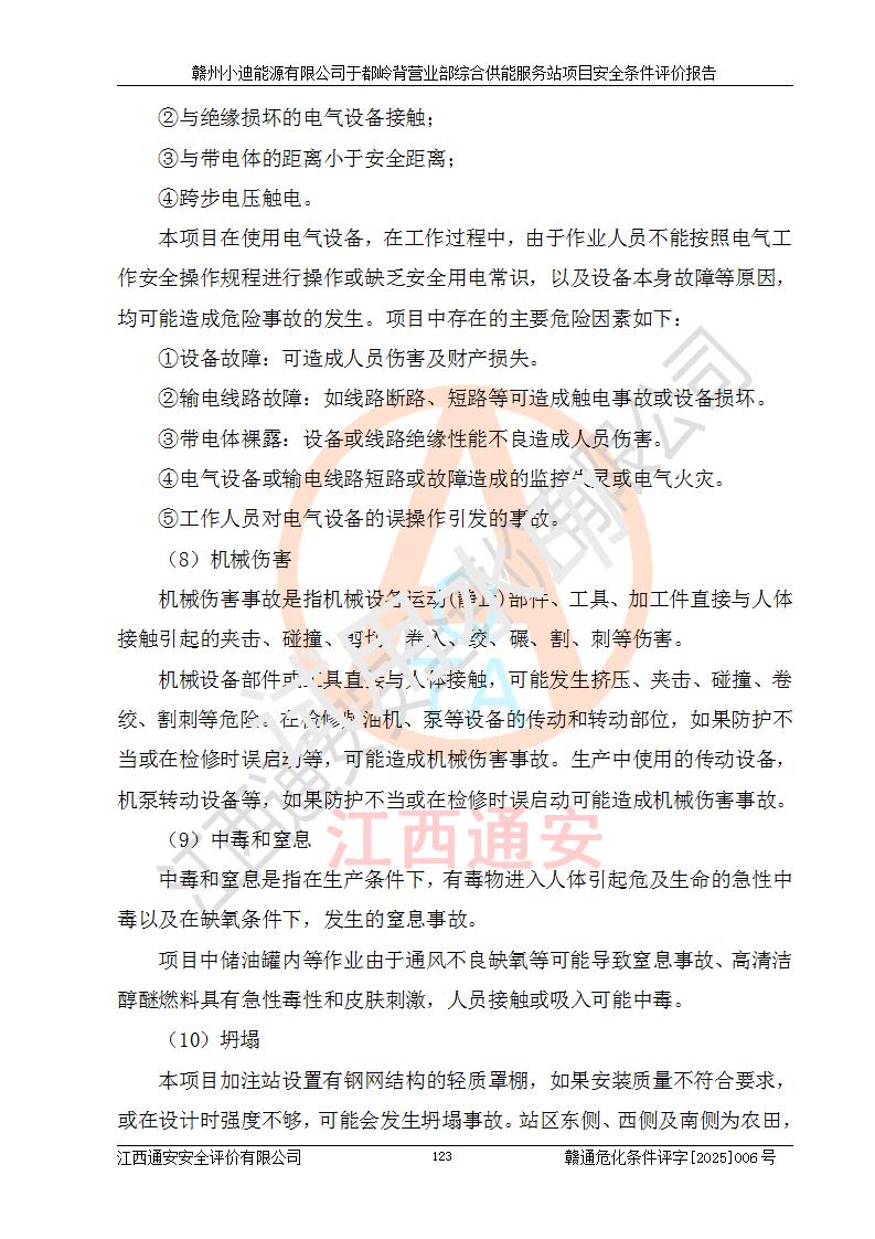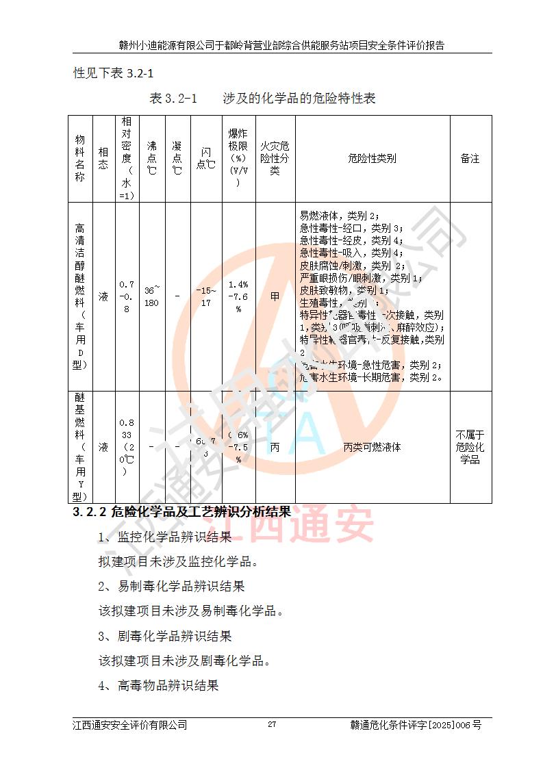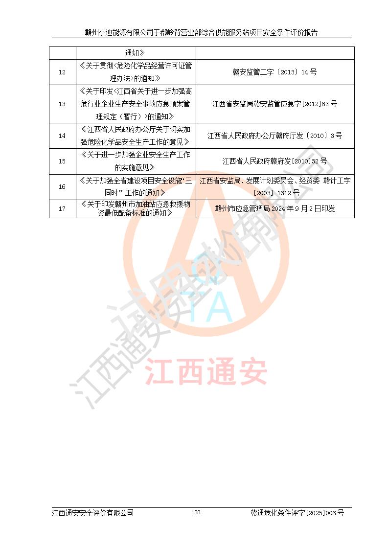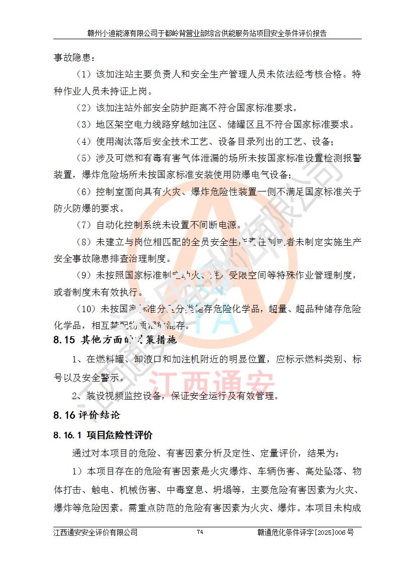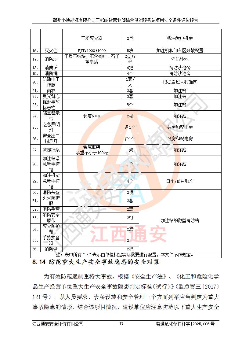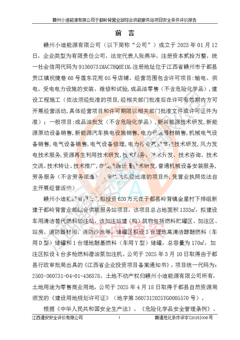 一、安全狀況綜合評(píng)述 通過(guò)對(duì)本項(xiàng)目的危險(xiǎn)、有害因素分析及定性、定量評(píng)價(jià),結(jié)果為: 1)本項(xiàng)目存在的危險(xiǎn)有害因素是火災(zāi)爆炸、**傷害、高處墜落、物體打擊、觸電、機(jī)械傷害、中毒窒息、坍塌等,主要危險(xiǎn)有害因素為火災(zāi)、爆炸等危險(xiǎn)因素。需重點(diǎn)防范的危險(xiǎn)有害因素為火災(zāi)、爆炸。本項(xiàng)目未構(gòu)成危險(xiǎn)化學(xué)品重大危險(xiǎn)源,也不存在劇毒、監(jiān)控、易制毒、易制爆化學(xué)品及高毒物品,高清潔醇醚燃料主要成分甲醇和石腦油為重點(diǎn)監(jiān)管危險(xiǎn)化學(xué)品,應(yīng)按照重點(diǎn)監(jiān)管危險(xiǎn)化學(xué)品相關(guān)規(guī)定管理。 2)預(yù)先危險(xiǎn)性分析表明該加注站儲(chǔ)存、經(jīng)營(yíng)過(guò)程中火災(zāi)、爆炸、觸電的危險(xiǎn)等級(jí)為Ⅲ級(jí),**傷害、高處墜落和中毒窒息等危險(xiǎn)等級(jí)為Ⅱ級(jí)。 3)從作業(yè)條件危險(xiǎn)性分析結(jié)果可以看出,在選定的評(píng)價(jià)單元中卸液作業(yè)、加注作業(yè)、變配電作業(yè)和維修作業(yè)中卸液作業(yè)中火災(zāi)爆炸、**傷害、觸電、中毒、窒息潛在危險(xiǎn)均為一般危險(xiǎn)。 4)從危險(xiǎn)度分析結(jié)果可以看出,燃料罐區(qū)屬中度危險(xiǎn)。 5)根據(jù)選址與總平面布置安全檢查表,該加注站符合《建筑設(shè)計(jì)防火規(guī)范》GB 50016-2014(2018年版)、《汽車(chē)加油加氣加氫站技術(shù)標(biāo)準(zhǔn)》GB50156-2021及《車(chē)用甲醇燃料加注站建設(shè)規(guī)范》(工信廳節(jié)〔2015〕129號(hào))等有關(guān)標(biāo)準(zhǔn)、規(guī)范的規(guī)定。該站與站外建筑物距離符合規(guī)范要求,站外50m內(nèi)無(wú)重要建筑物和明火設(shè)施。 6)根據(jù)立項(xiàng)批文及于都縣自然資源局出具的建設(shè)用地規(guī)劃許可證,該加注站符合有關(guān)部門(mén)的審批。 7)本項(xiàng)目采用成熟的工藝設(shè)備,項(xiàng)目在嚴(yán)格按照**相關(guān)法律、法規(guī)及技術(shù)標(biāo)準(zhǔn)制造、安裝、檢測(cè)檢驗(yàn)的情況下,其安全生產(chǎn)風(fēng)險(xiǎn)程度在可接受范圍。 8)本項(xiàng)目危害物質(zhì)為高清潔醇醚燃料(車(chē)用D型,甲類(lèi))和醚基燃料(車(chē)用Y型,丙類(lèi)),應(yīng)重點(diǎn)注意火災(zāi)、爆炸危害,做好防火防靜電措施。**加注站罐區(qū)、加注區(qū)無(wú)明火產(chǎn)生;卸液口應(yīng)設(shè)置防靜電報(bào)警器,罐區(qū)法蘭應(yīng)跨接,防止靜電引起火災(zāi)爆炸事故。 四、評(píng)價(jià)結(jié)論 贛州小迪能源有限公司于都嶺背營(yíng)業(yè)部綜合供能服務(wù)站項(xiàng)目總平面布置符合相關(guān)規(guī)范的要求。在項(xiàng)目建設(shè)和運(yùn)行階段,總平面布置設(shè)計(jì)、施工圖設(shè)計(jì)和建設(shè)施工、安裝調(diào)試及生產(chǎn)運(yùn)行中,應(yīng)嚴(yán)格執(zhí)行**有關(guān)安全生產(chǎn)法律、法規(guī)和有關(guān)標(biāo)準(zhǔn)、規(guī)范,將本報(bào)告中提出的安全對(duì)策措施落實(shí)到位,真正做到安全設(shè)施與主體工程同時(shí)設(shè)計(jì)、同時(shí)施工、同時(shí)投入生產(chǎn)和使用,項(xiàng)目建成后危險(xiǎn)、有害因素可以得到**控制,安全風(fēng)險(xiǎn)在可接受范圍,擬建的贛州小迪能源有限公司于都嶺背營(yíng)業(yè)部綜合供能服務(wù)站項(xiàng)目符合法律法規(guī)、標(biāo)準(zhǔn)、規(guī)章和規(guī)范的要求。 |